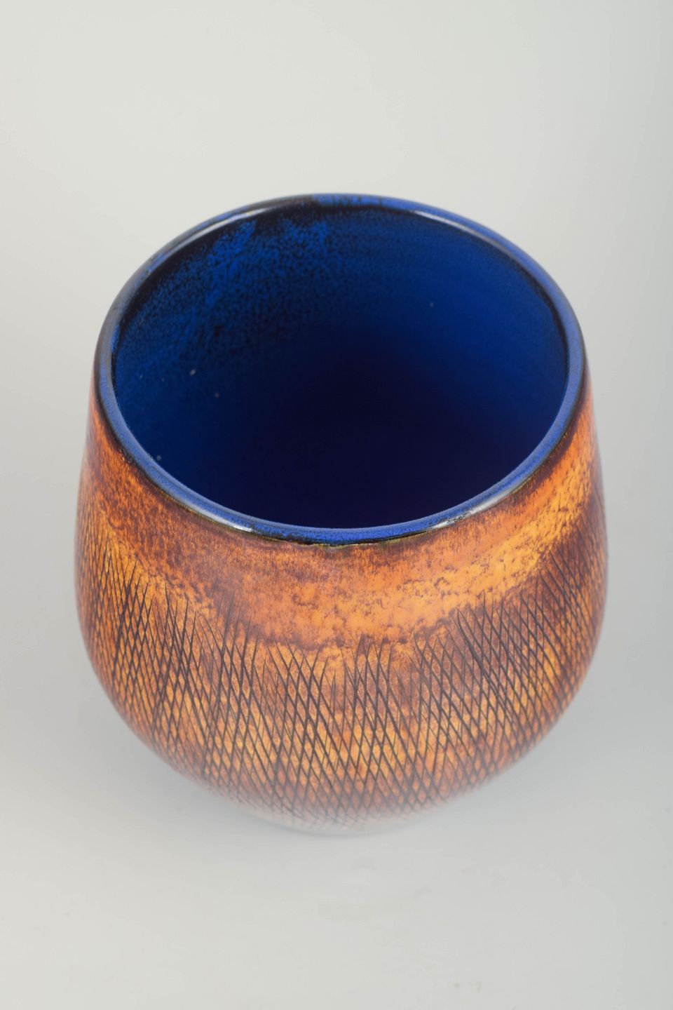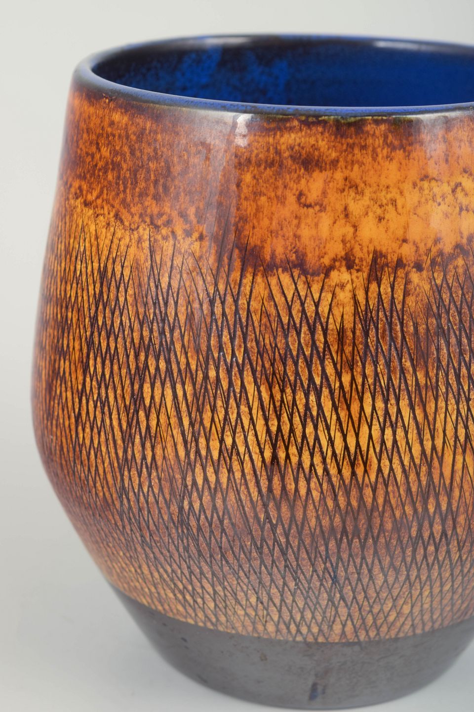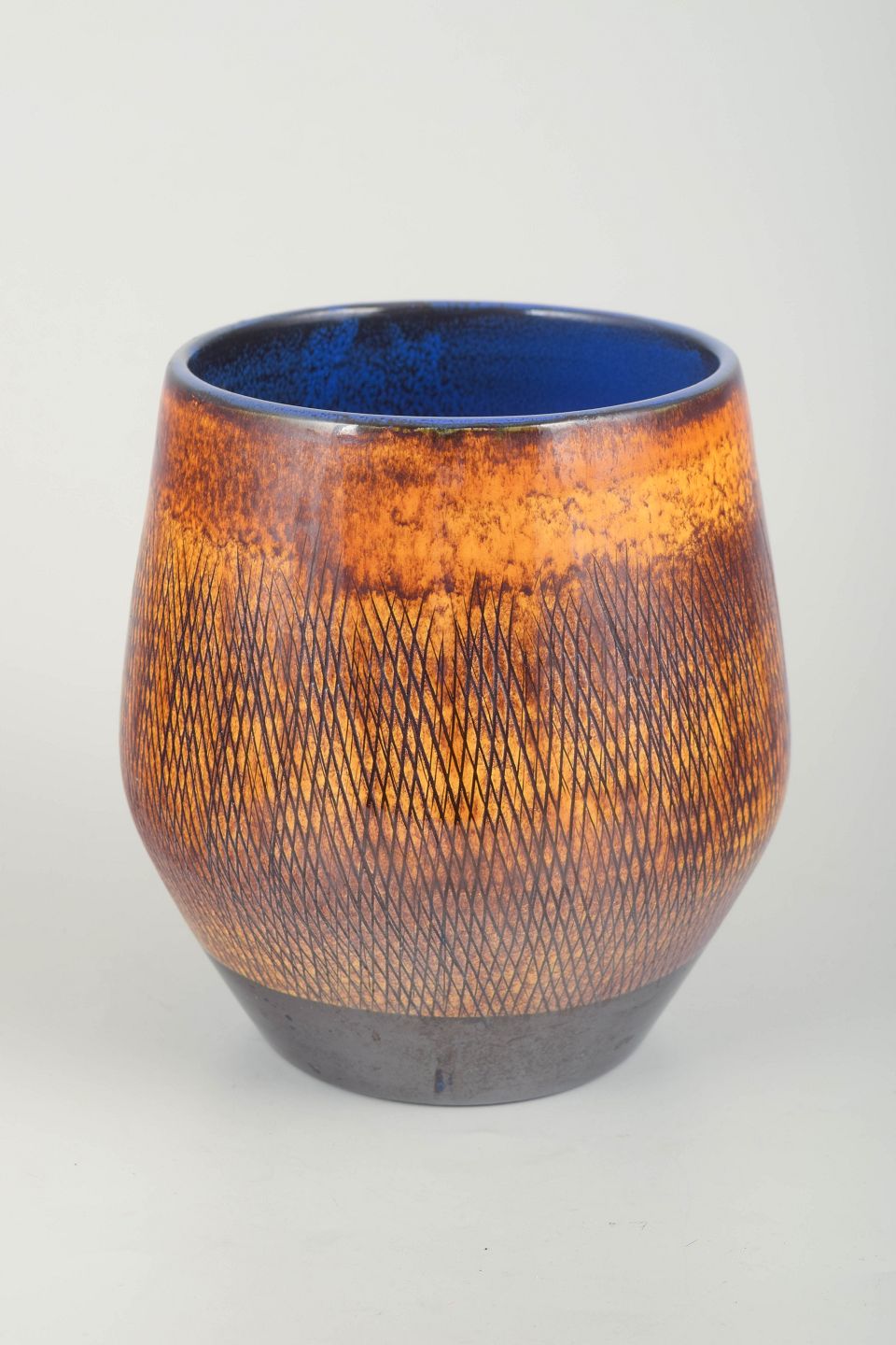 Dekorativ vase i stentøj med karakteristisk orange og brun glasur med indridset mønster og dyb blå glasur indvendigt. Model 2610.