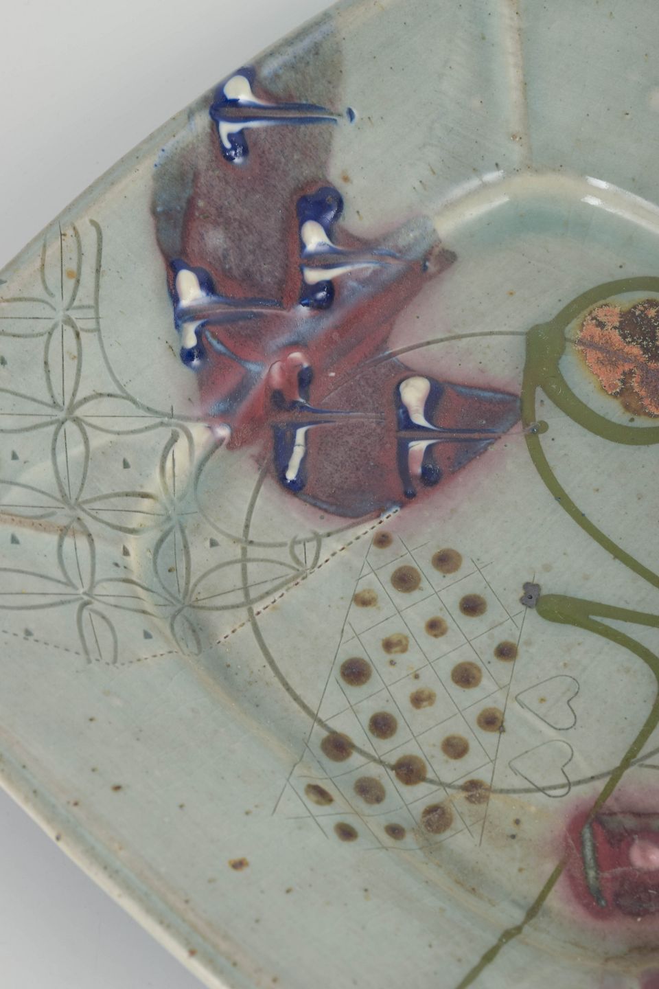 Unikt kvadratisk fad i kinesisk-inspireret stil med dekorativ relief- og penselmalet dekoration samt lys celadonlignende glasur med farvede detaljer. Signeret.