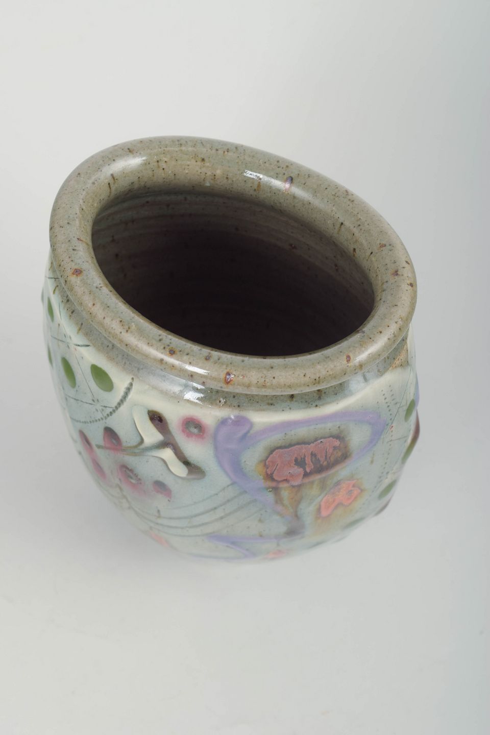 Unik vase i kinesisk-inspireret stil med dekorativ relief- og penselmalet dekoration samt lys celadonlignende glasur med farvede detaljer. Signeret.