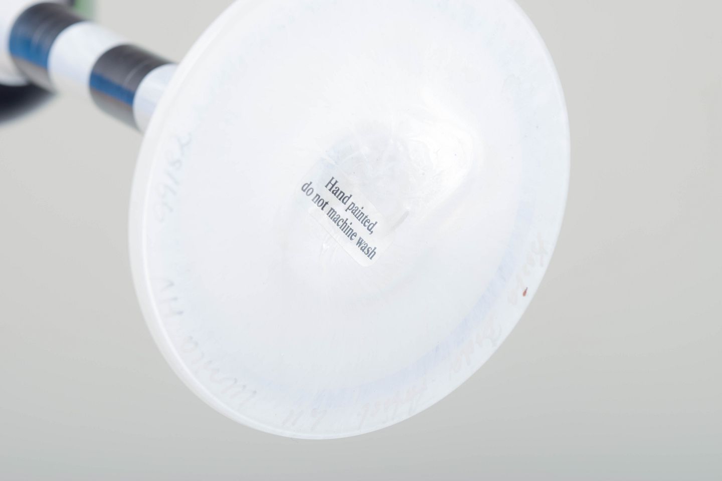 Højt dekorativt kunstglas med håndmalet blomstermotiv i gule og grønne toner på mørk baggrund, samt karakteristisk stribet stilk i sort og hvid. Signeret.