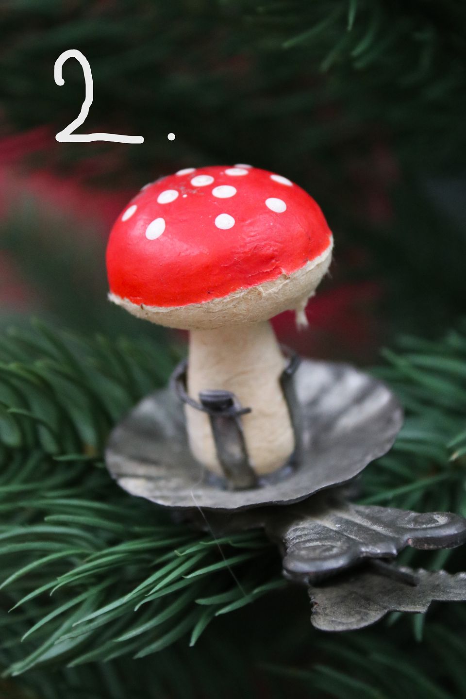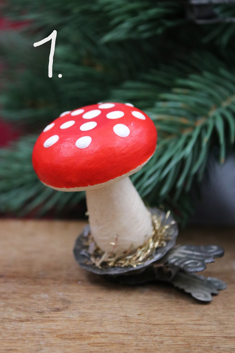 Gammel juletræspynt i form af julesvamp (rød fluesvamp) lavet i presset vat som sidder på gammel metal clips.