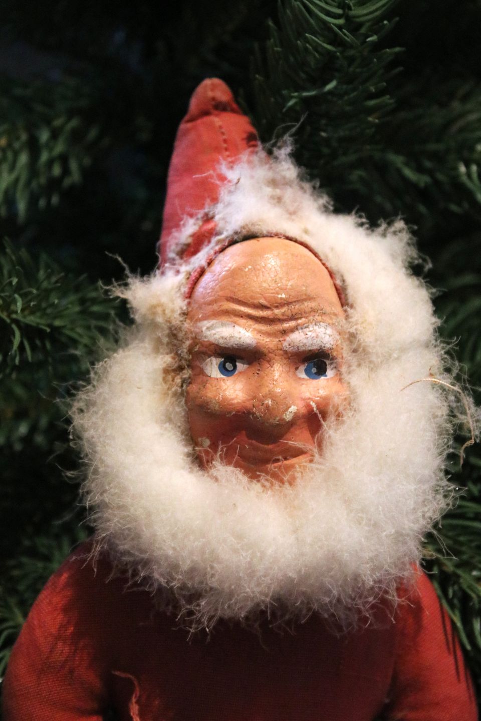 Fin , gammel julemand med krop i rødt stof med bemalet papmache ansigt og skæg af dun. H: 30cm.