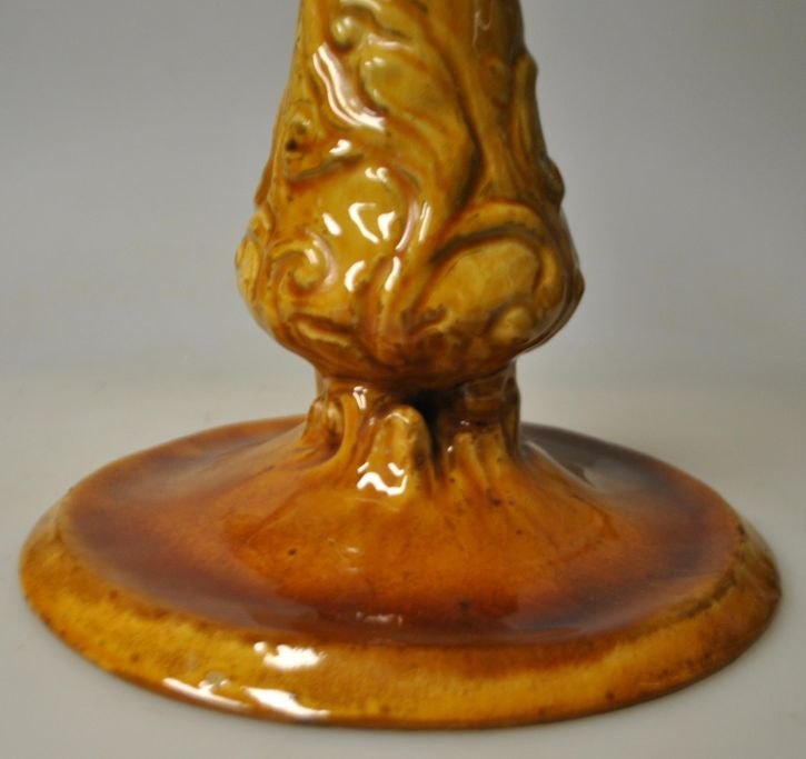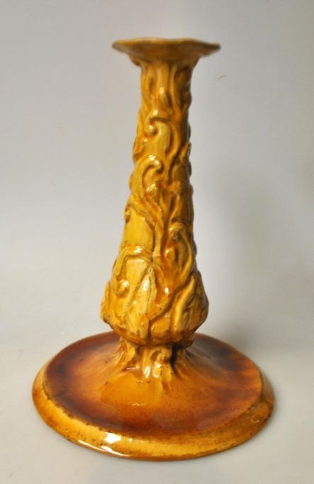 Hammershøj, Svend (1873 - 1948) Dänemark: Kerzenständer. 1904 - 1908. Glasiertes Steingut. Gelb glasiert. Mit Verzierung. Hergestellt von HA Kähler in Næstved. H.: 23 cm. Durchm. Fuß: 16,5 cm.