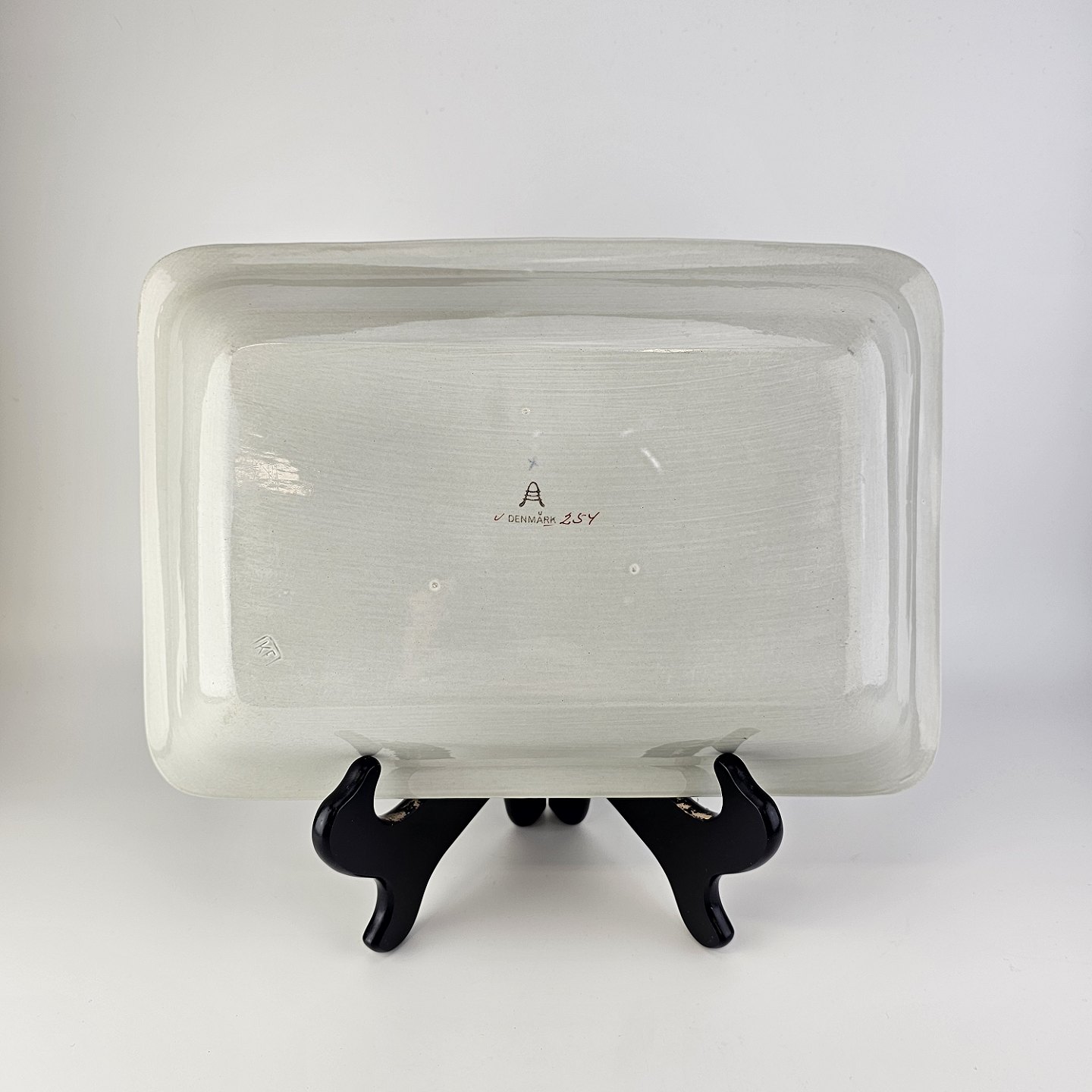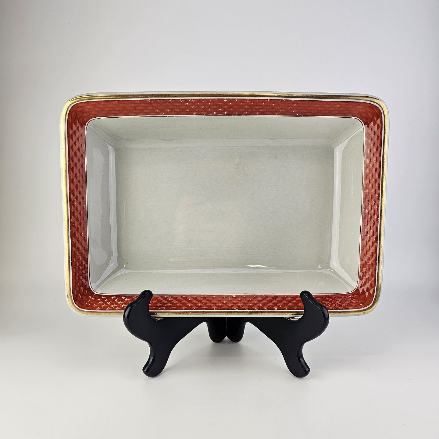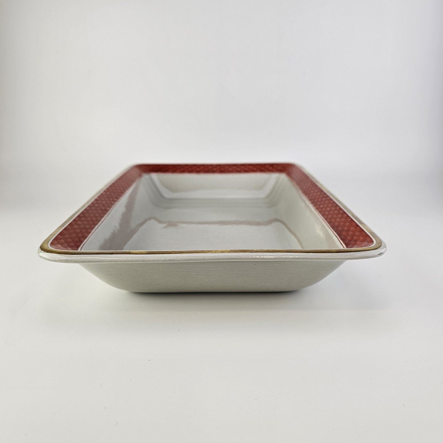 Tureby er stel i fajance dekoreret med rødt bånd og guldkant