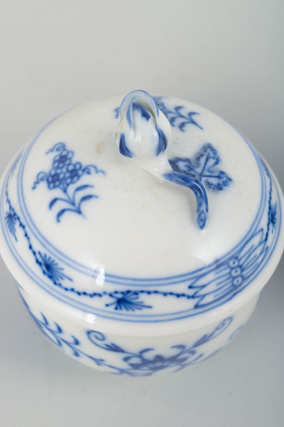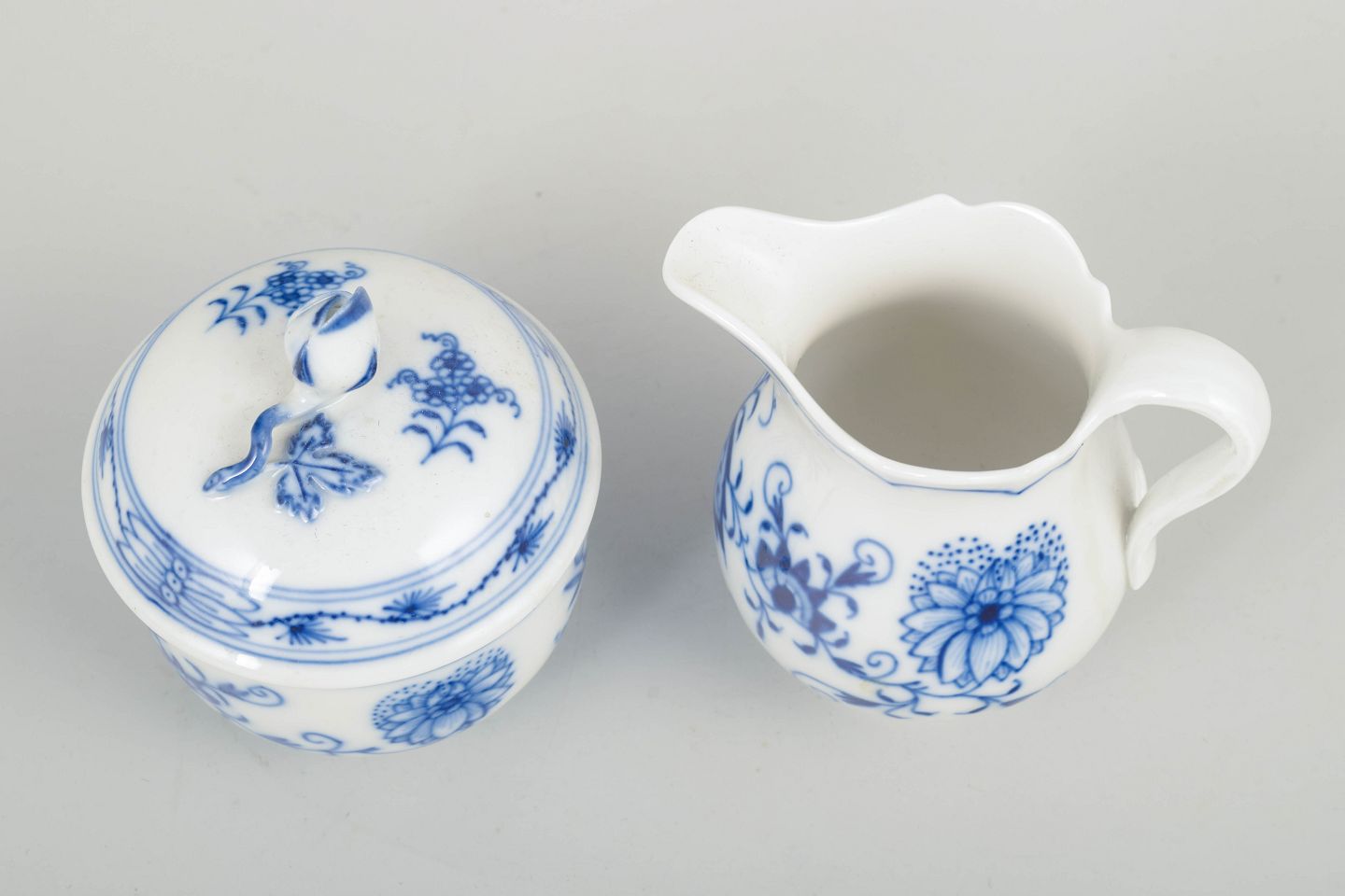Et charmerende sæt bestående af en klassisk sukkerskål med låg samt en flødekande i det ikoniske løgmønstret (Zwiebelmuster). Begge dele er håndmalet i koboltblå underglasur og udført i de elegante former, der kendetegner Meissens tidlige 1900-tals produktion.