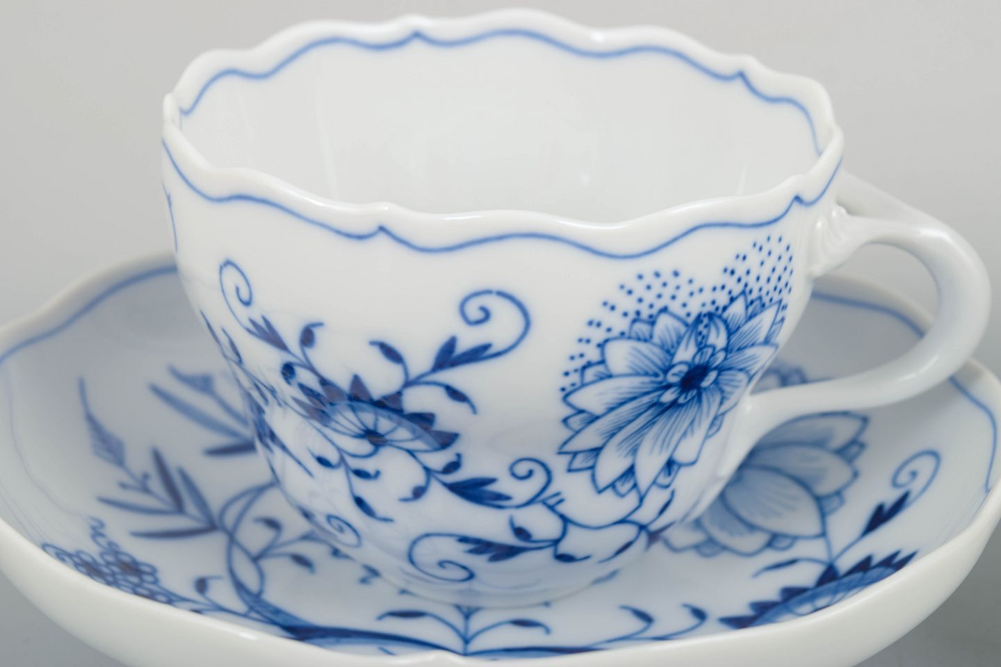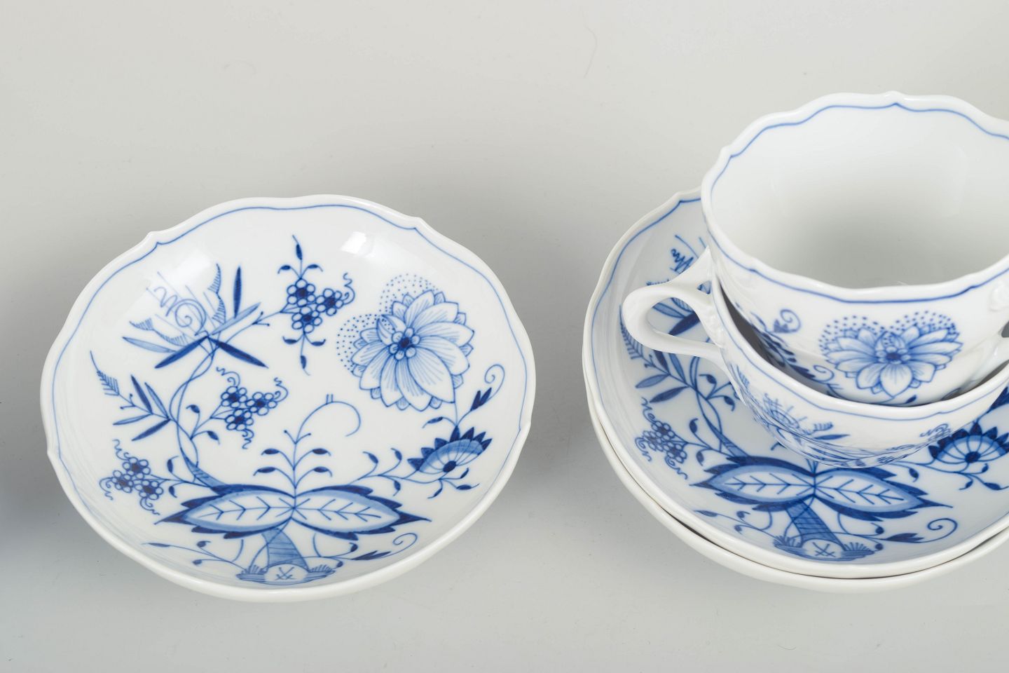 Text zugänglich auf Dänische: Meissen løgmønstret, tre kaffekopper med tilhørende underkopper.