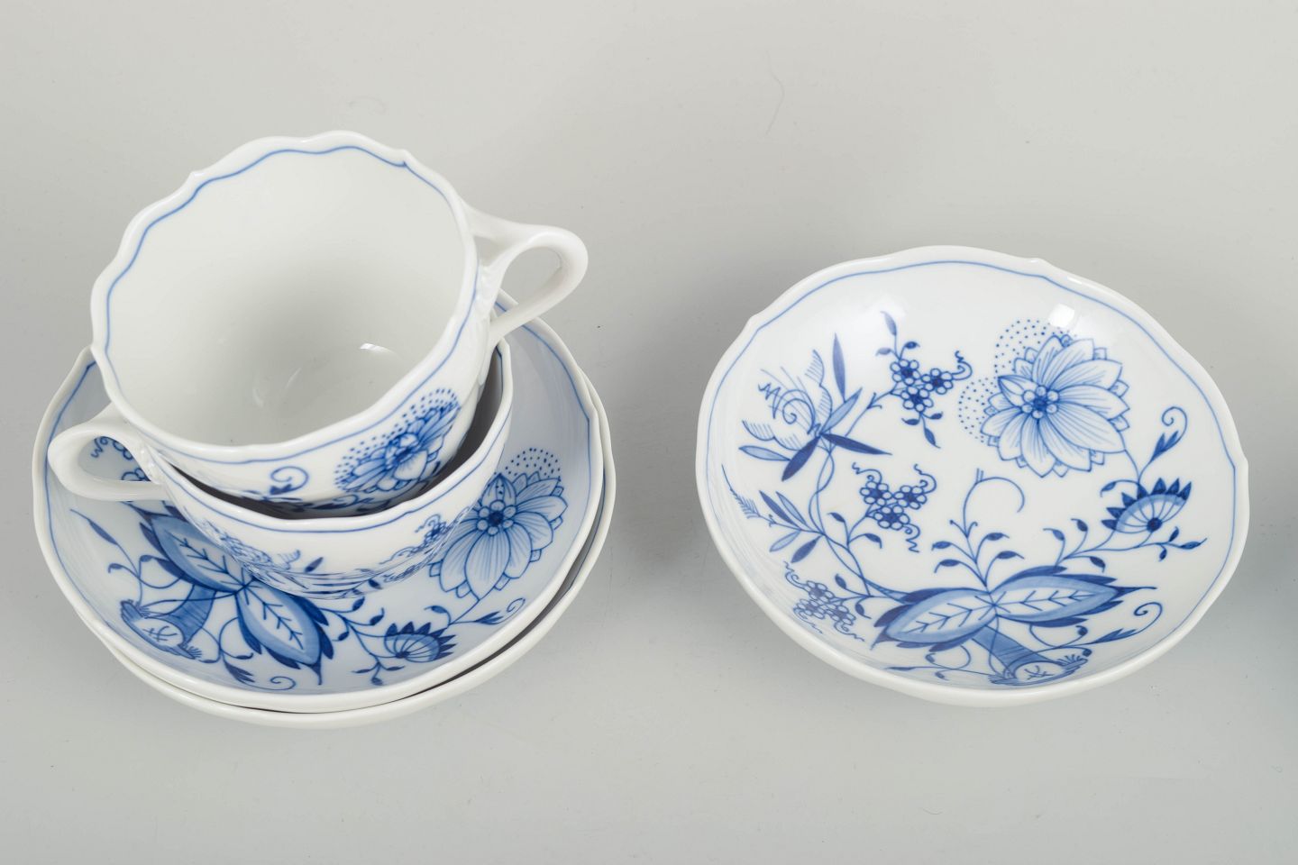 Text zugänglich auf Dänische: Meissen løgmønstret tre kaffekopper med tilhørende underkopper.