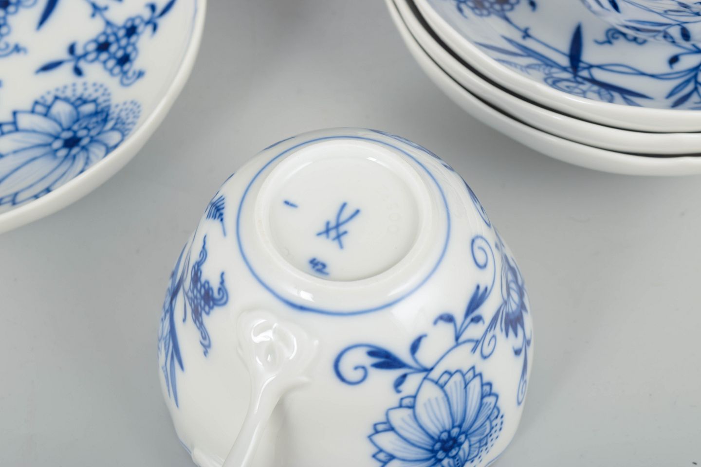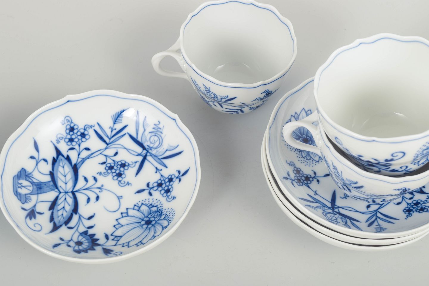 Text zugänglich auf Dänische: Meissen løgmønstret fire kaffekopper med tilhørende underkopper.