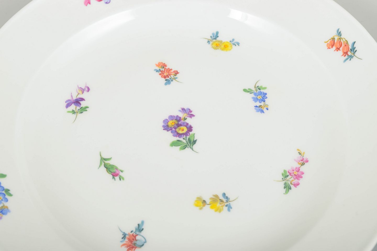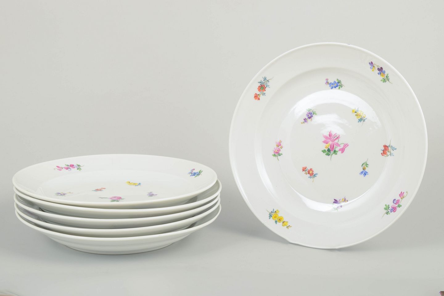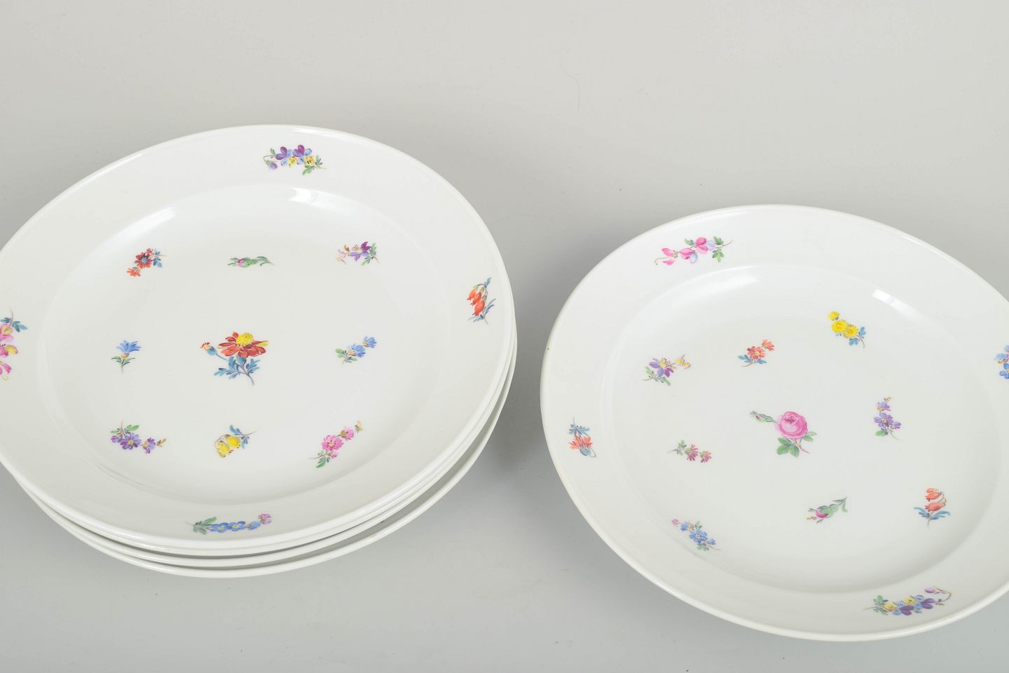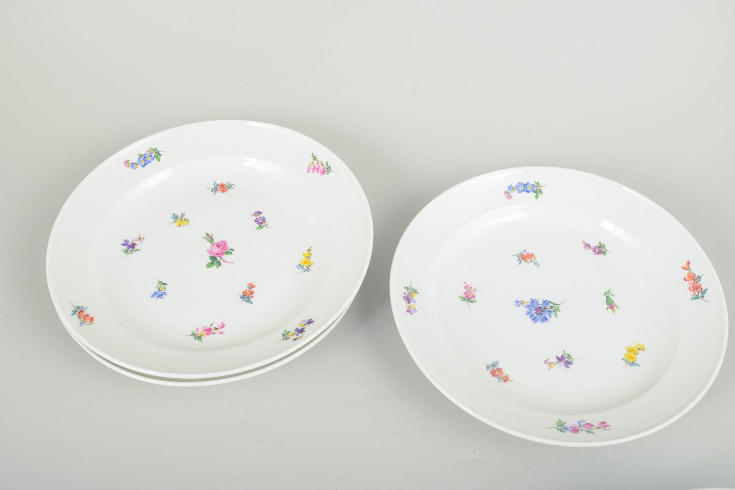Smukke Meissen porcelænstallerkener med håndmalede polykrome blomsterdekorationer langs randen og i midten. Klassiske, let svungne former i traditionel Meissen stil.