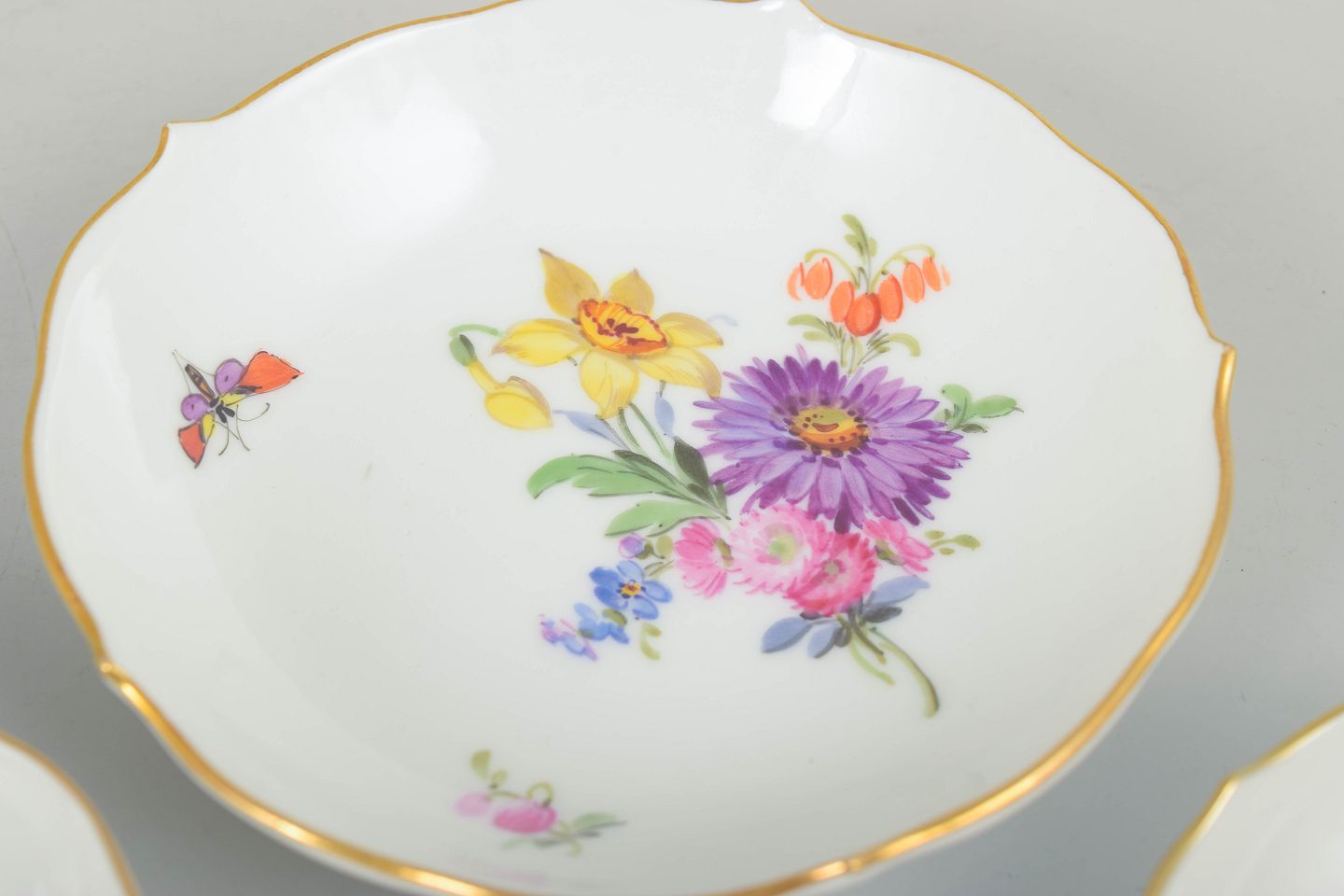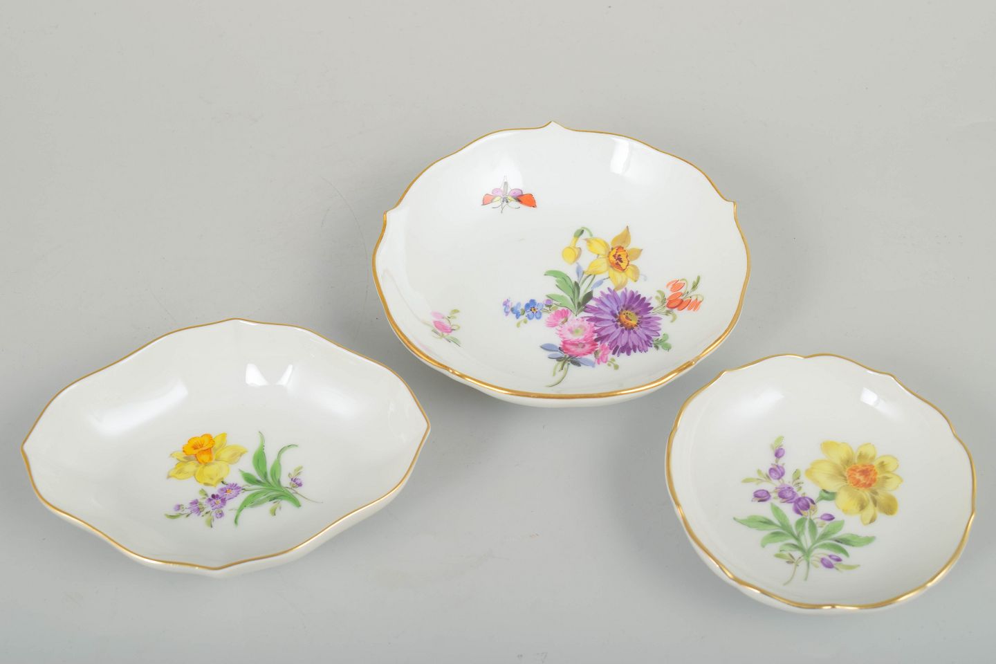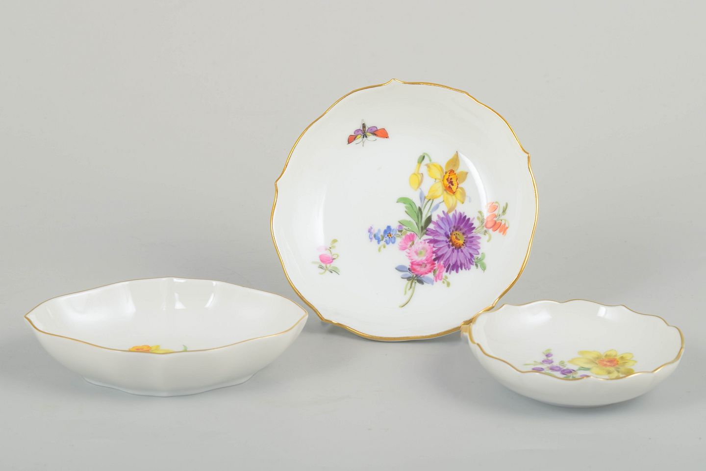 Tre små Meissen-porcelænsfade med håndmalet blomsterdekoration og fin guldkant. Let kuperede former med klassisk polykromt blomstermotiv.