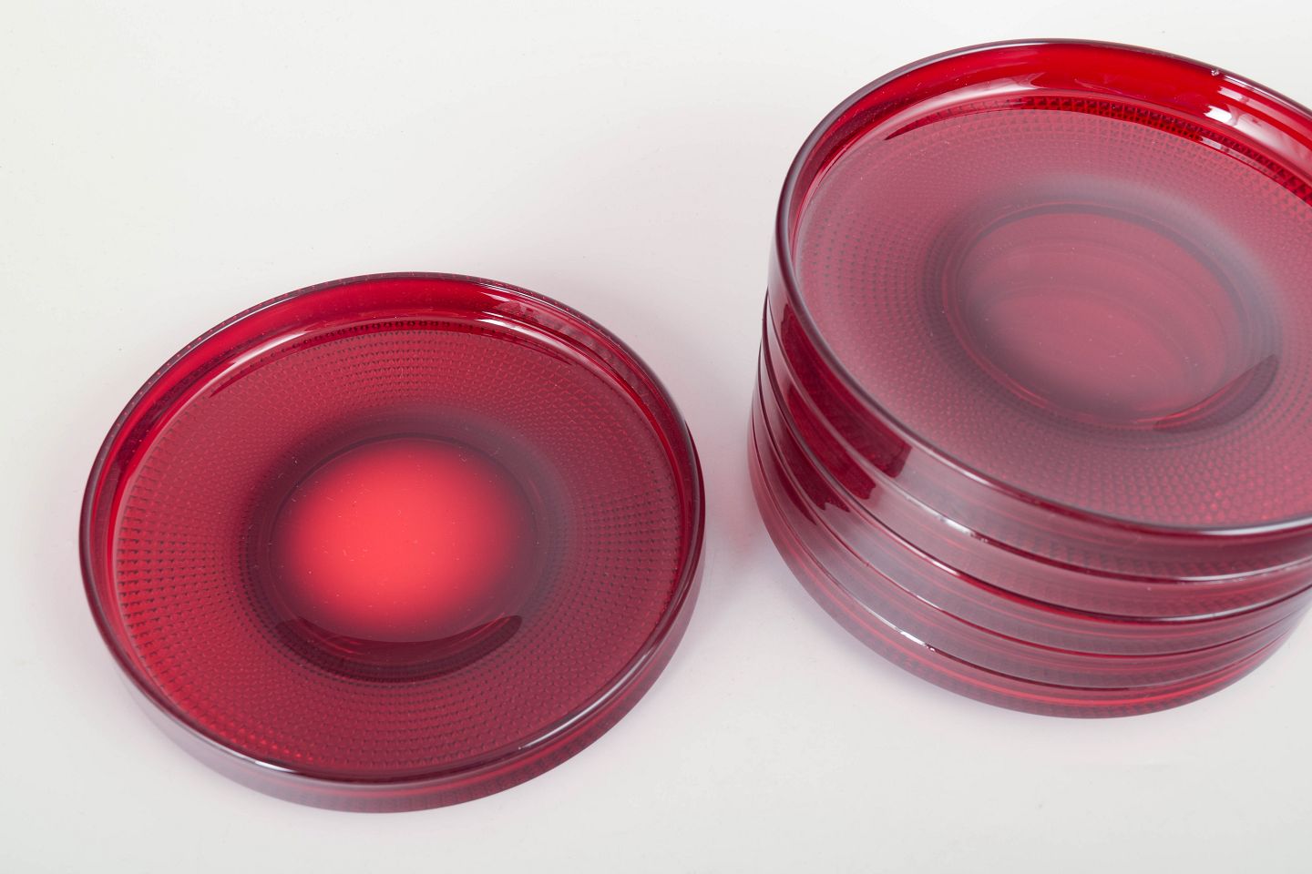Sæt med seks flade tallerkener i dybt rubinrødt glas fra Gullaskruf, model “Vineta”, kendt for sin karakteristiske optiske prikkestruktur og intense farvemætning. Et smukt og tidstypisk eksempel på svensk glasdesign.