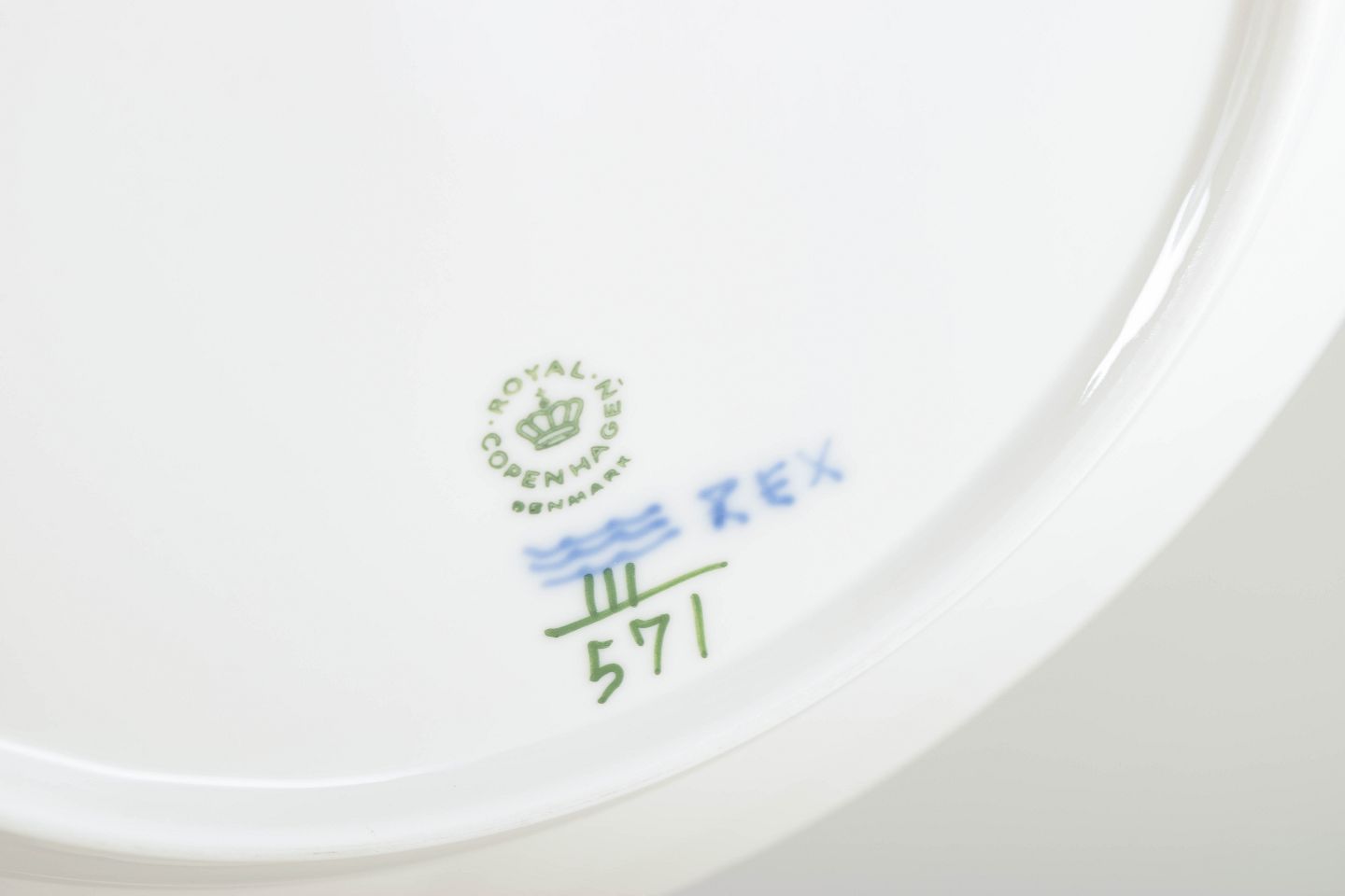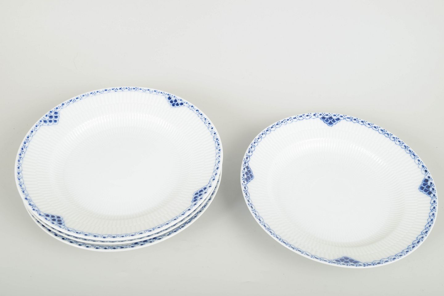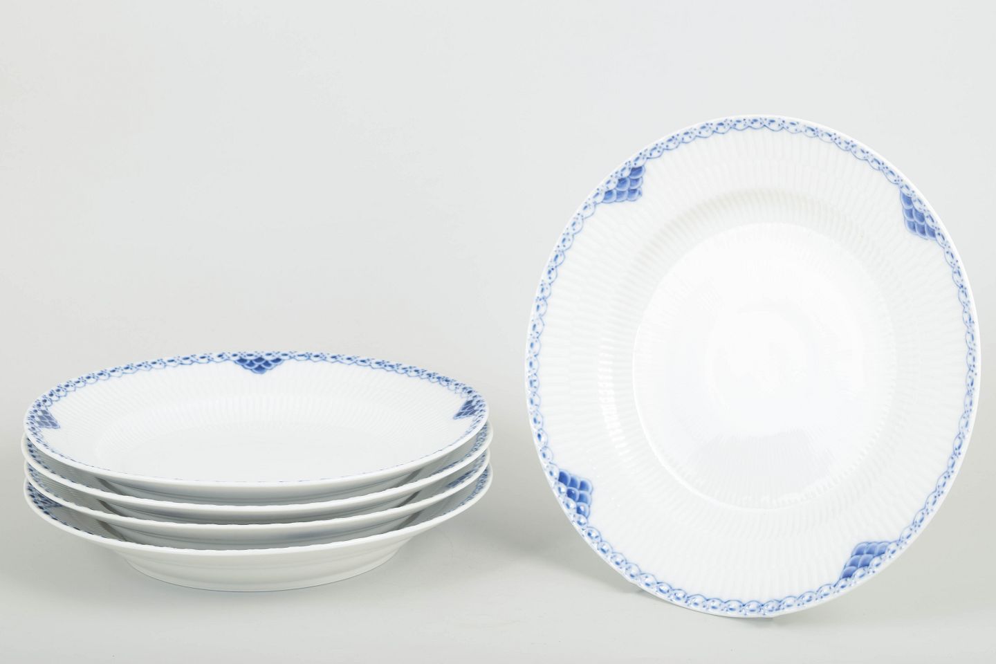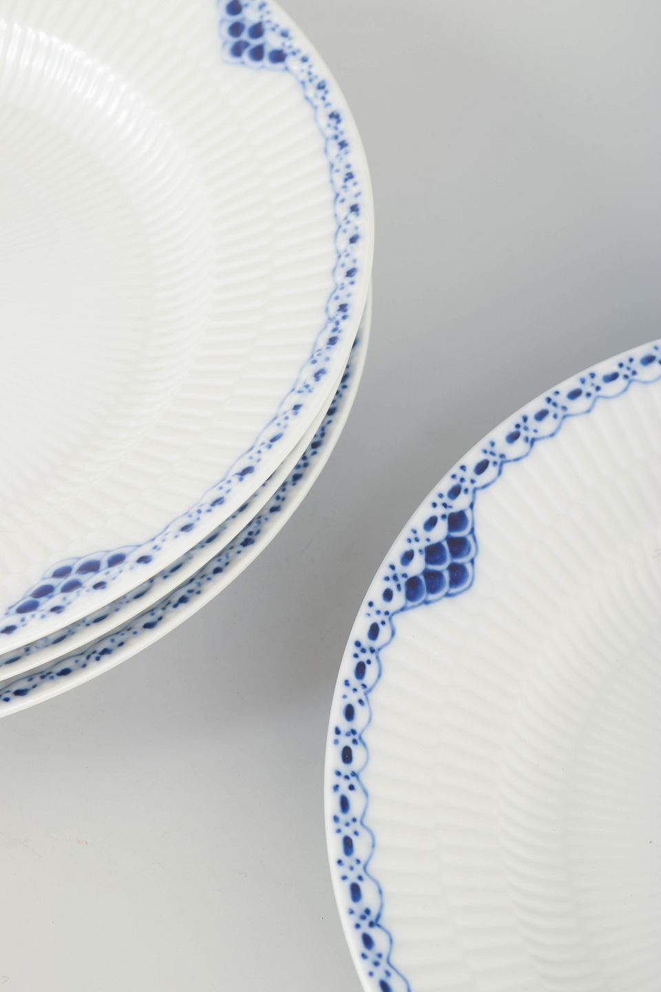 Sæt af fem klassiske tallerkener i hvidt porcelæn med riflet spejl og håndmalet blå border i det ikoniske Prinsesse-mønster.