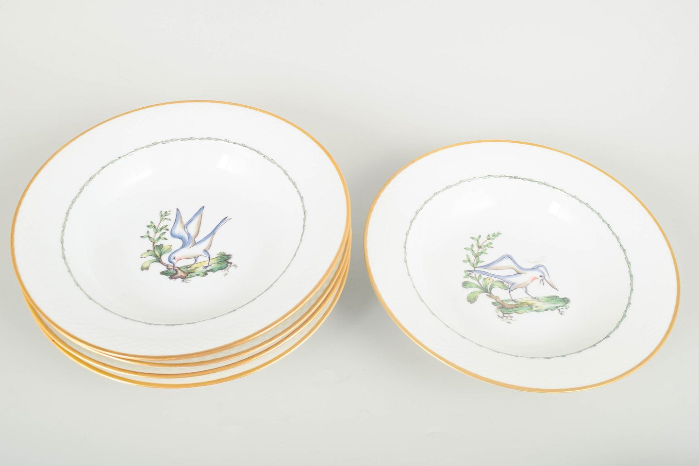 Sjældne dybe tallerkener i porcelæn fra Royal Copenhagen med motiv af fugle og botaniske elementer (model 550/8107). Hver tallerken er kantet med guldrand og har et elegant, let riflet fletrelief langs kanten.
