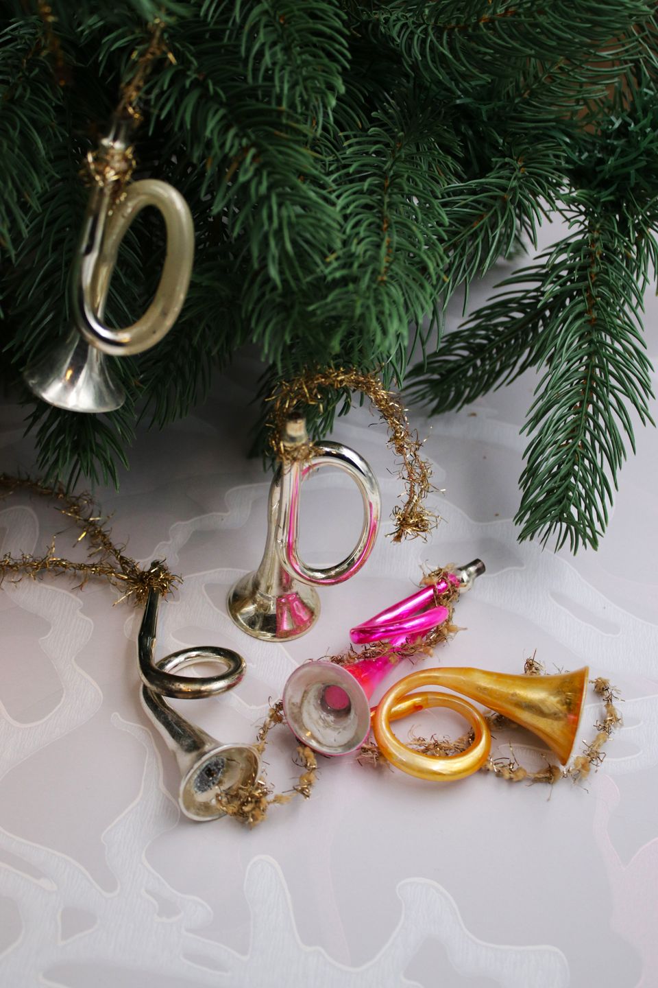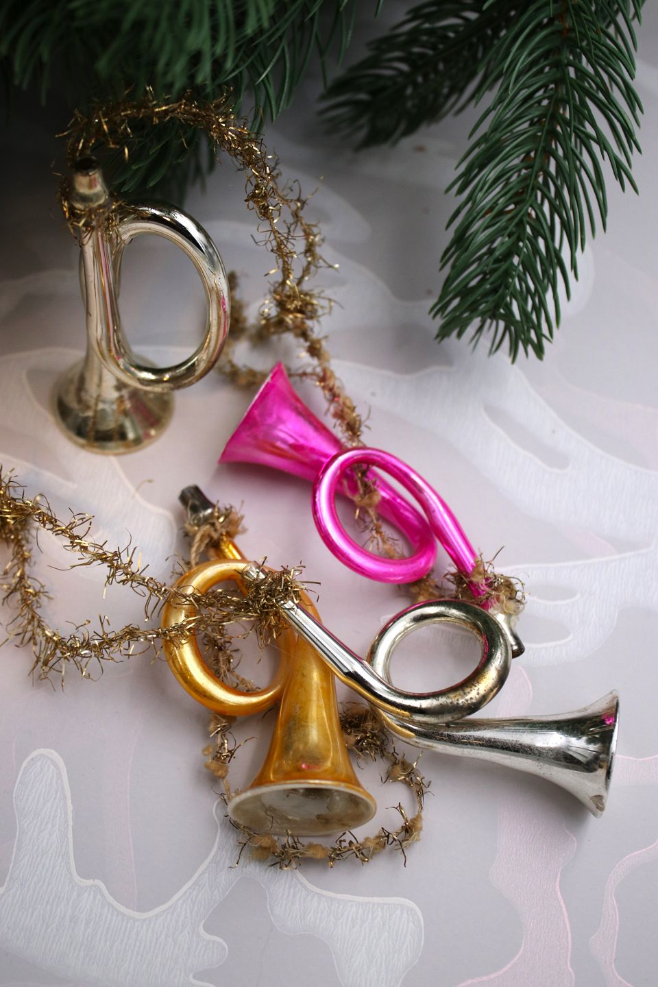 Gammelt juletræspynt i form af juletrompeter i tyndt glas