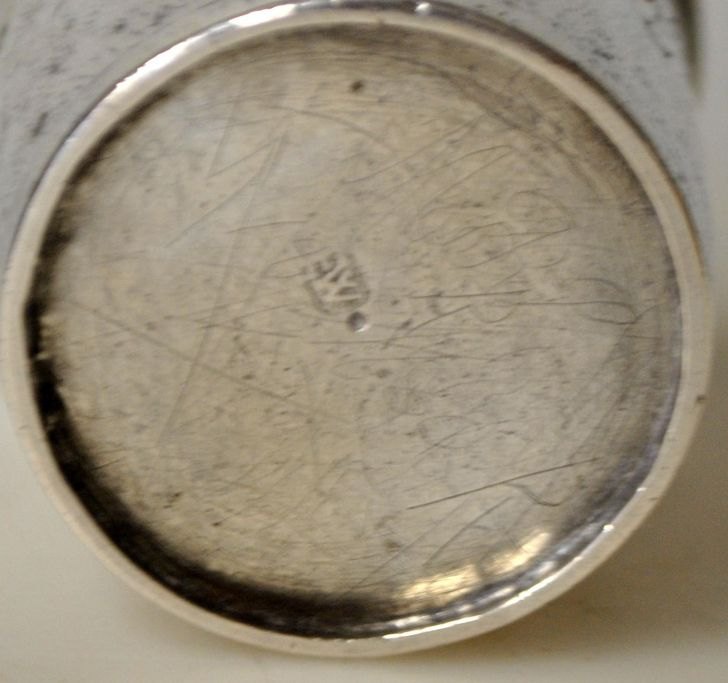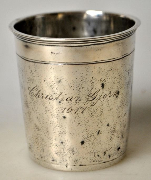 Erik Andersen Winther (1661–1725), Silberschmied in Aarhus, Dänemark: Barocker Kelch mit Gravuren: P, NS B – AND 1704. Mit Meistermarke gestempelt. Höhe: 6 cm.