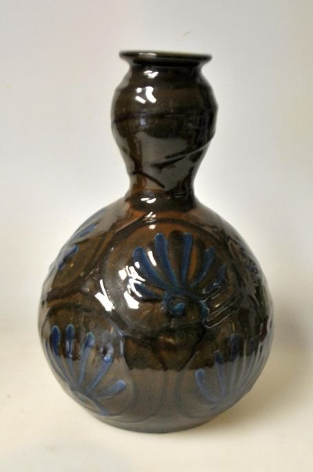 Vase von Herman A. Kähler, 1920–1930, Næstved, Dänemark. Mit bräunlichen, blauen und schwarzen Glasuren. Signiert, Höhe: 19,5 cm.
