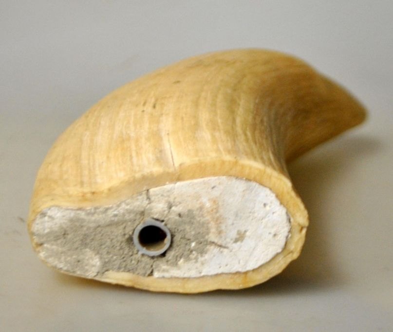Zahn eines grönländischen Pottwals, 19./20. Jahrhundert. Länge: 13 cm. Gefüllt, sodass er auf einer Platte montiert werden kann.