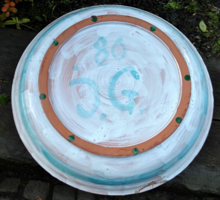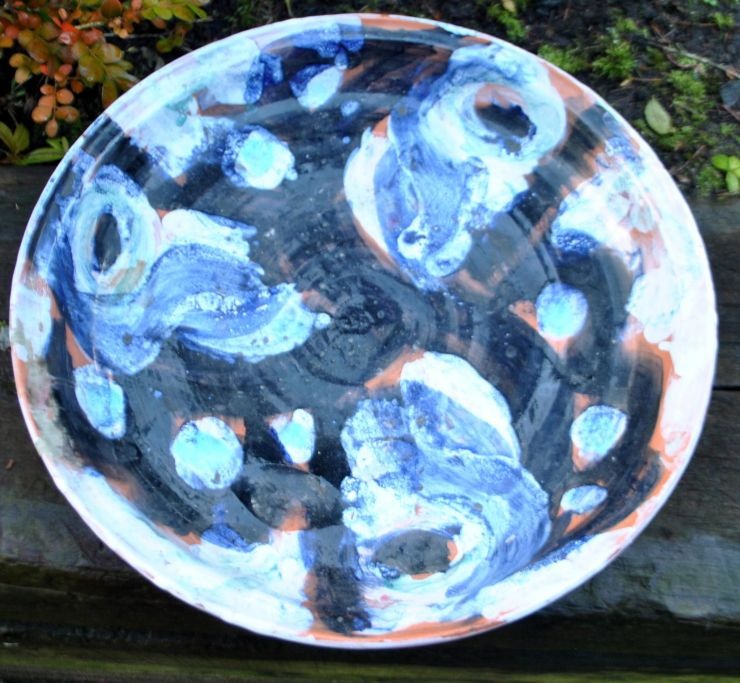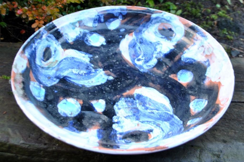 Glud, Jørgen (1913–2003), Dänemark: Keramikschale, 1980. Roter Ton. Glasur in Schwarz, Blau, Weiß und Grün. Signiert: JG 80. Durchmesser: 37 cm.