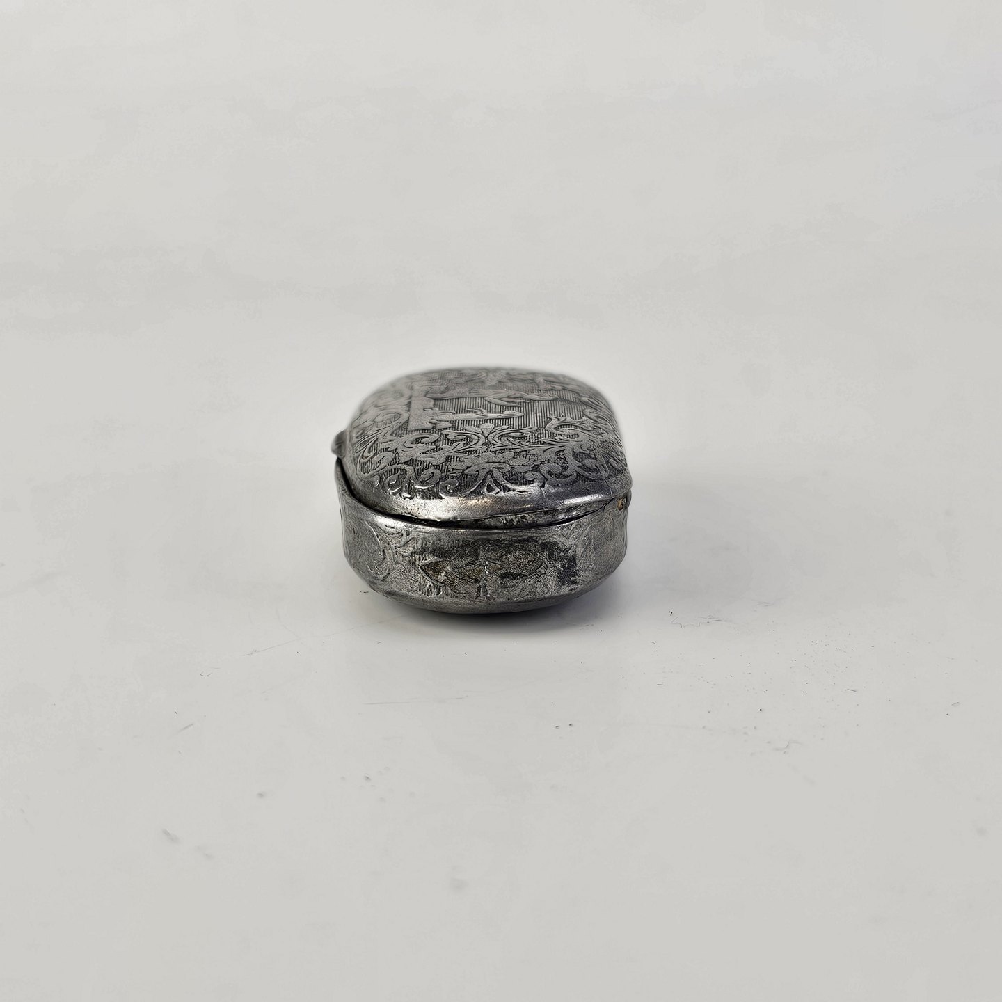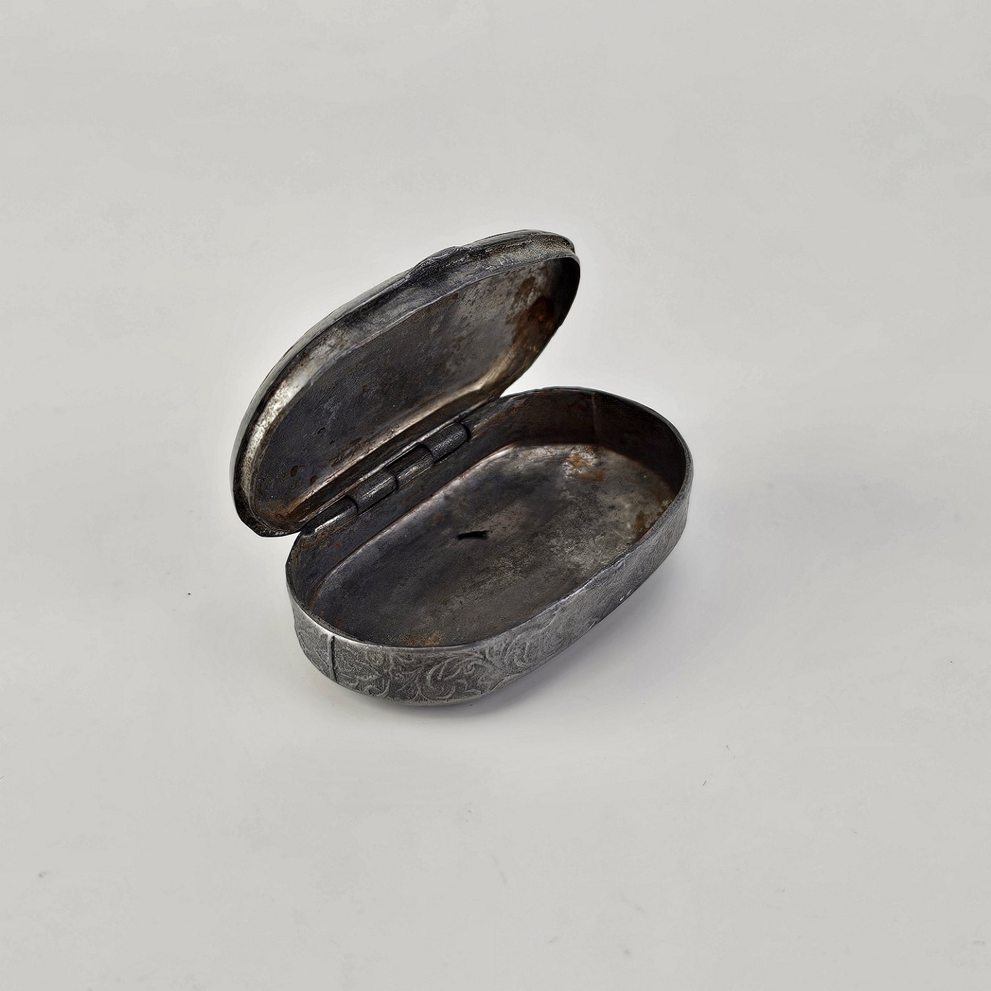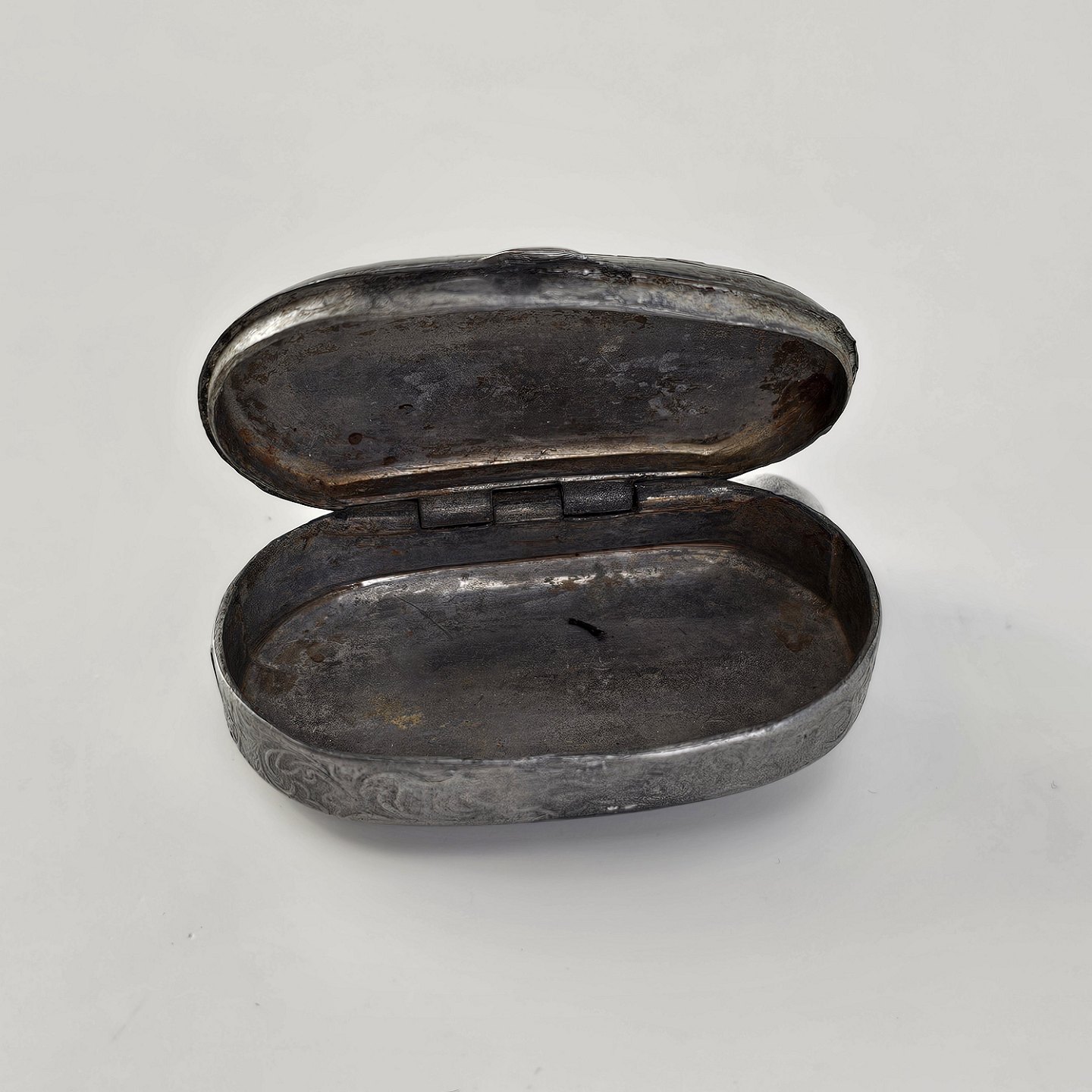 Pilleæske i tin med motiv af en dreng og en hund omgivet af bladmotiver