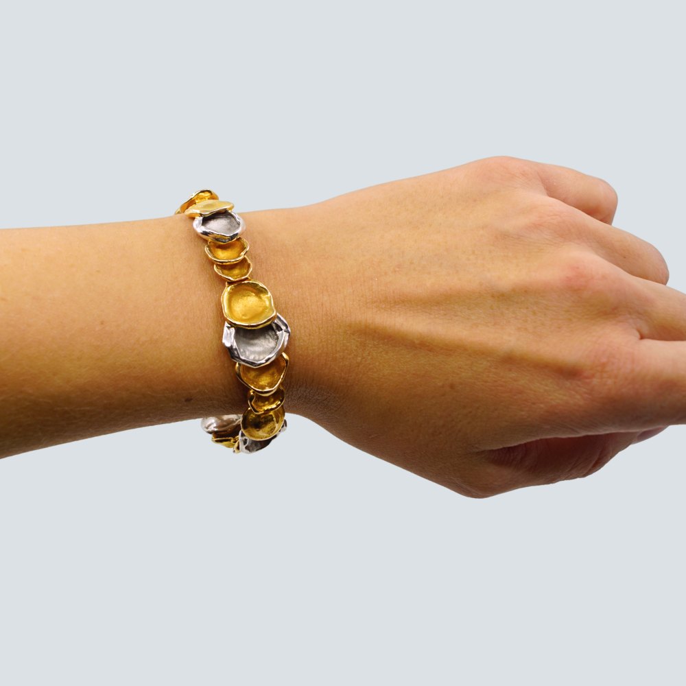 Text zugänglich auf Dänische: Carl Antonsen; Armbånd sammensat af led i 14 kt. guld og hvidguld. Med kasselås og to sikkerhedslåse.
