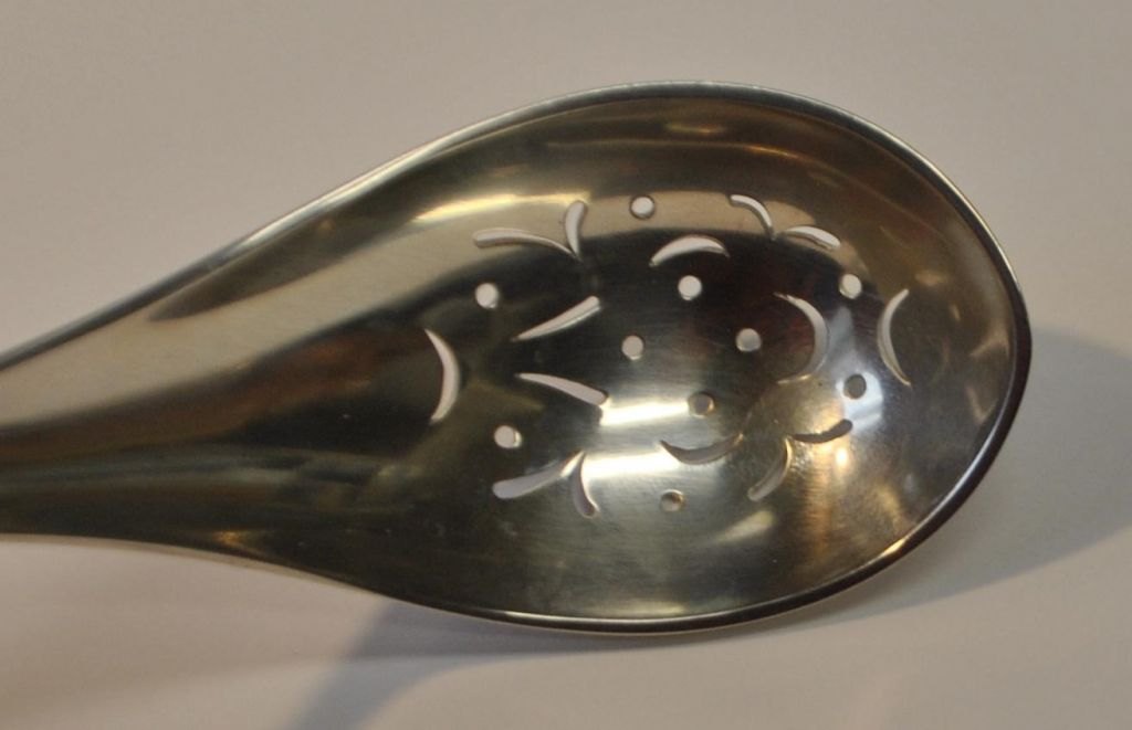 Eislöffel aus Sterlingsilber von Hans Hansen, 20. Jahrhundert. Kolding, Dänemark. Mit Lochverzierungen auf der linken Seite. Gestempelt: Hans Hansen 925 Sterling Denmark. Länge: 17,5 cm. Gewicht: 64 Gramm.