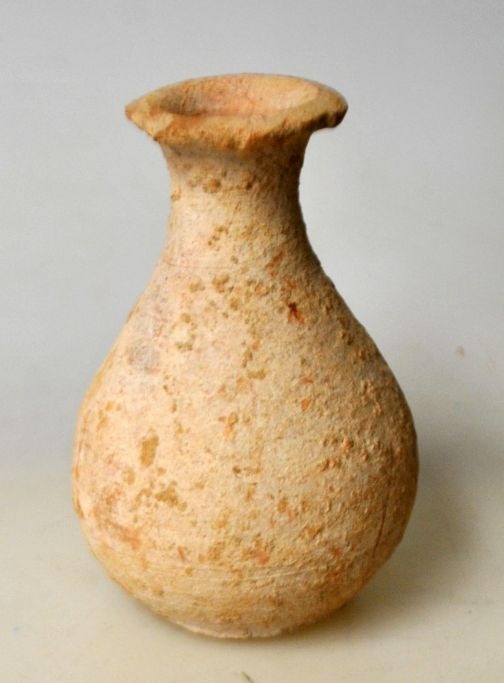 Antikes römisches Parfümfläschchen. Fundstück aus dem Boden. Roter Ton. Höhe: 9,5 cm.
