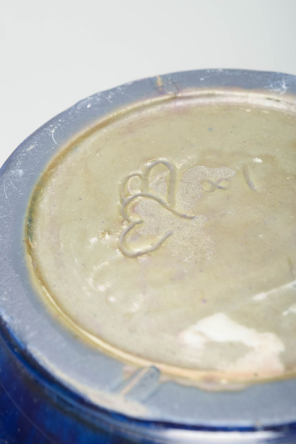 Håndlavet keramikvase i udpræget Art Nouveau-stil med organiske, reliefdekorerede linjer og dyb blå/grøn løbeglasur. Et tidligt dansk kunsthåndværkseksempel fra perioden omkring 1. verdenskrig.
