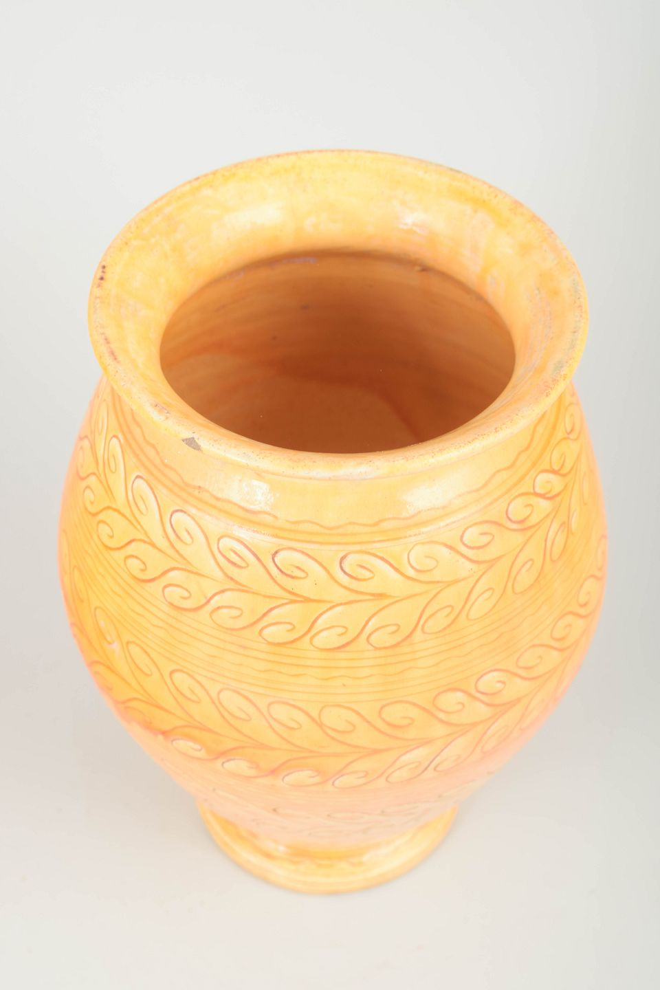 Høj gul-orange vase i keramik med karakteristisk indridset bladdekor i horisontale bånd – et klassisk dekorationsmotiv hos Kähler i 1930’erne. Formen er elegant buet med let udsvajet hals og rund fod. Lille skår på randen.