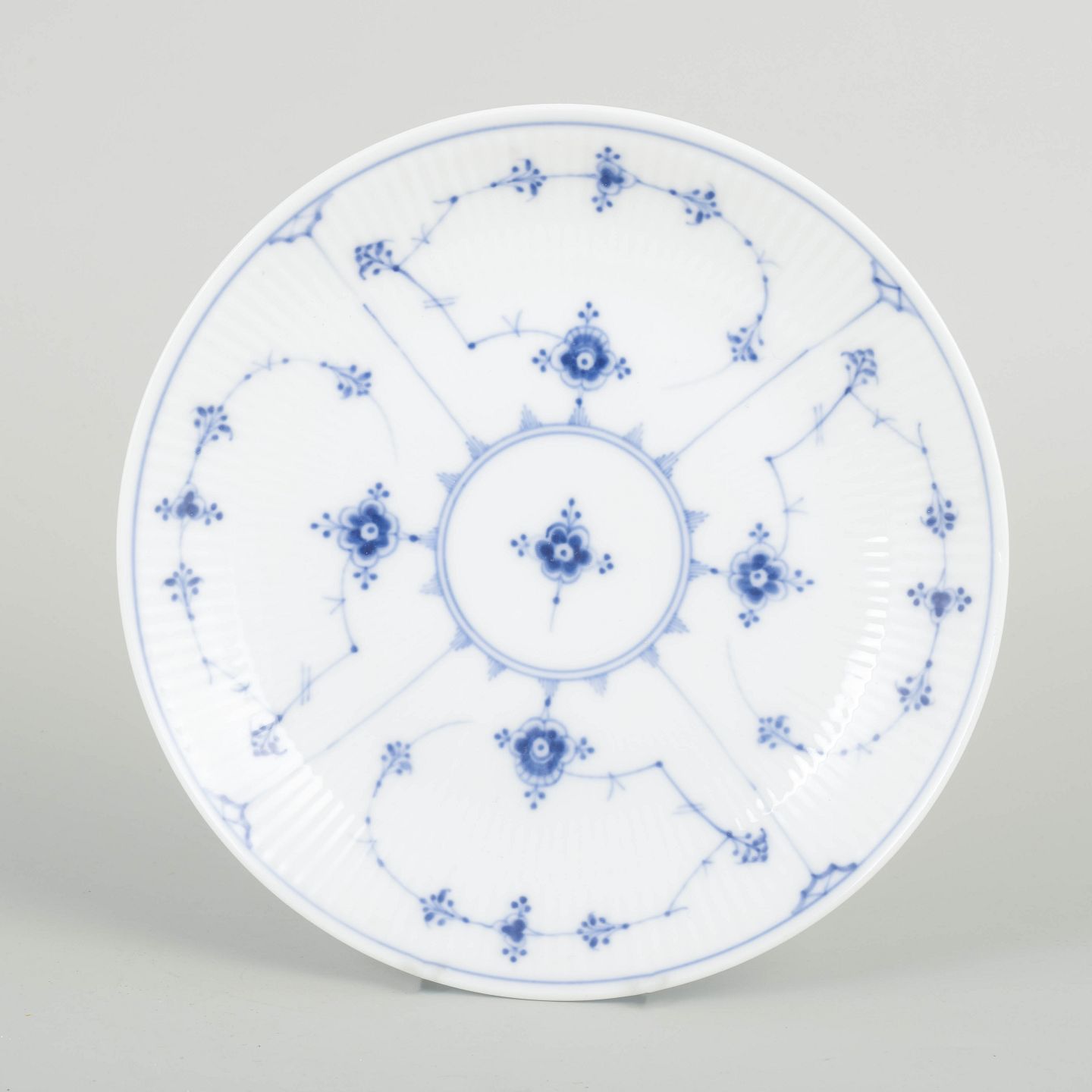 Klassisk rundt fad i musselmalet riflet porcelæn, håndmalet i koboltblå på riflet korpus. Den enkle, elegante form kombineret med det tidlige 1900-tals malearbejde gør dette fad til et smukt og autentisk eksempel på Royal Copenhagens historiske produktion.