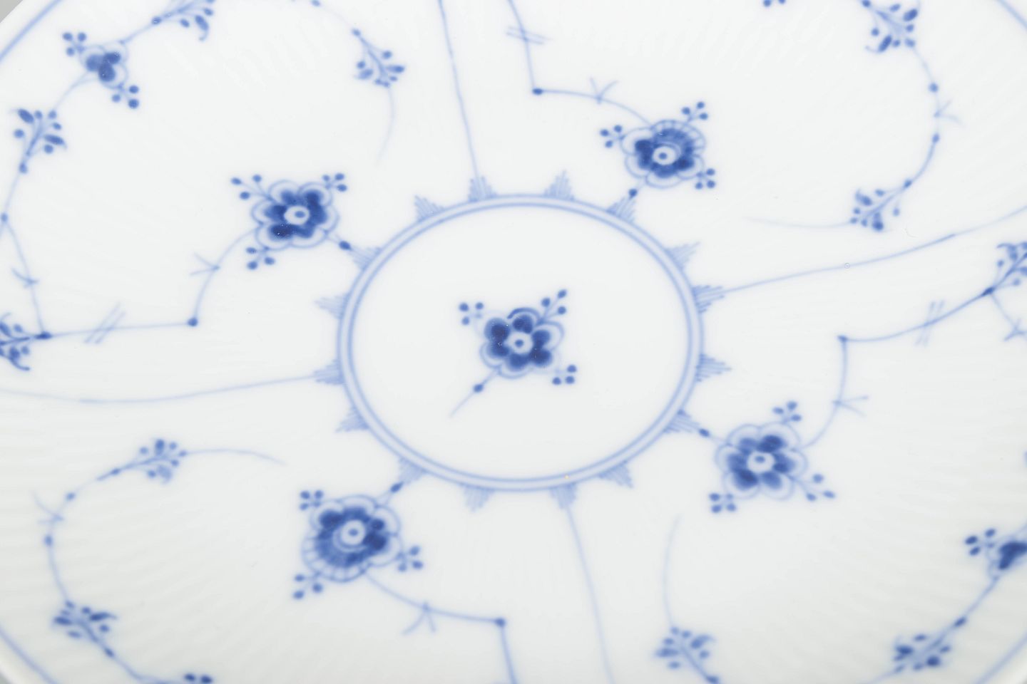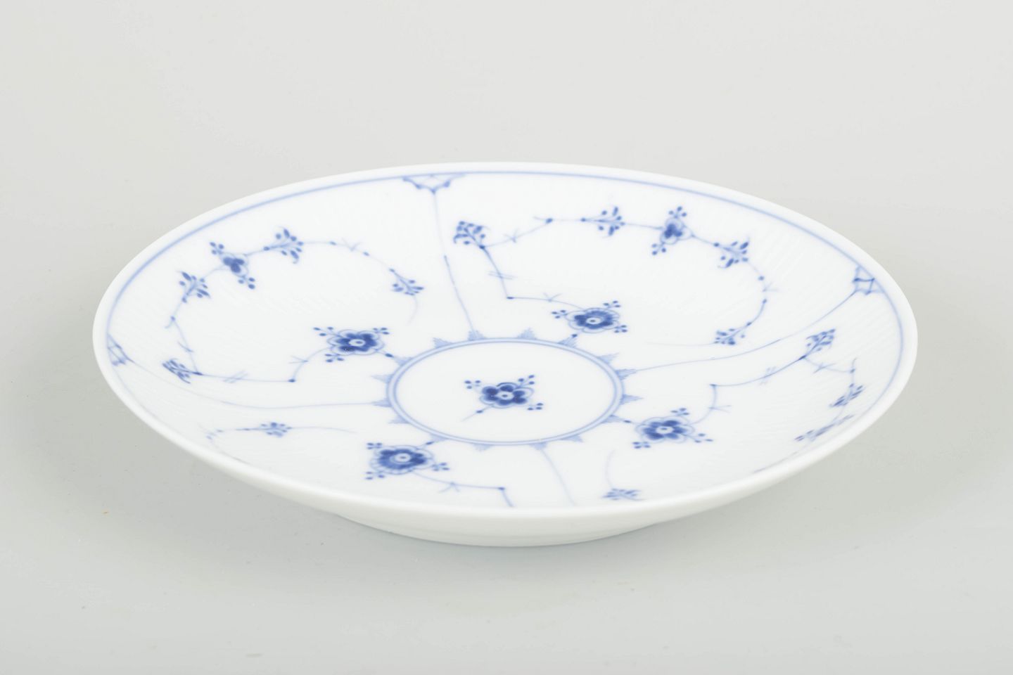 Musselmalet riflet blev introduceret i 1775 og er Royal Copenhagens mest ikoniske stel. De tidlige eksemplarer, som dette, fremstår med fine, håndmalede variationer, der gør hvert stykke unikt og eftertragtet blandt samlere.