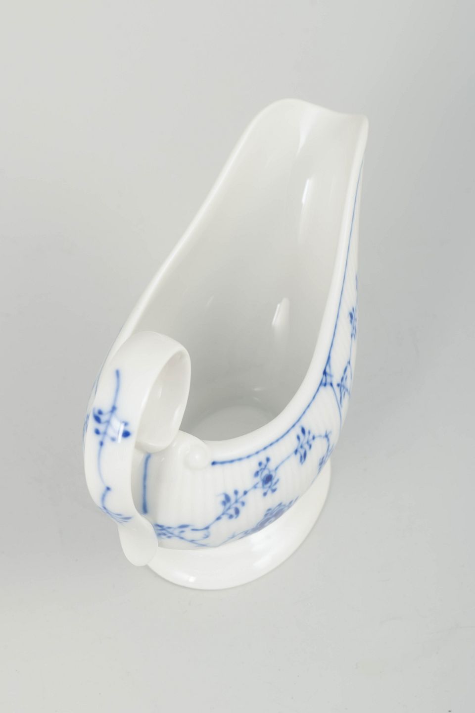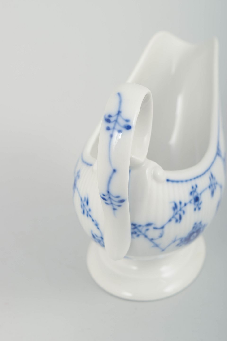 Klassisk saucekande i musselmalet porcelæn med elegant svungen hank og håndmalet koboltblå dekoration på riflet korpus. produktion.