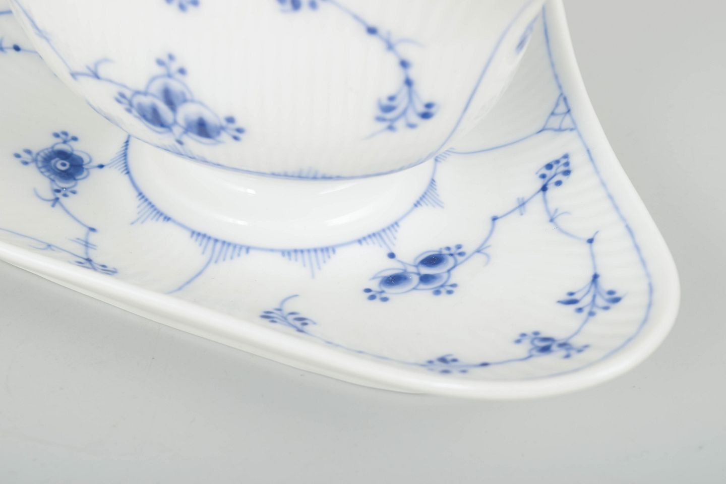 Musselmalet riflet blev introduceret i 1775 som Royal Copenhagens første stel og er fortsat et af verdens mest ikoniske porcelænsmønstre. Den fine håndmalede dekoration udføres af højt specialiserede porcelænsmalere, hvilket gør hvert stykke unikt.