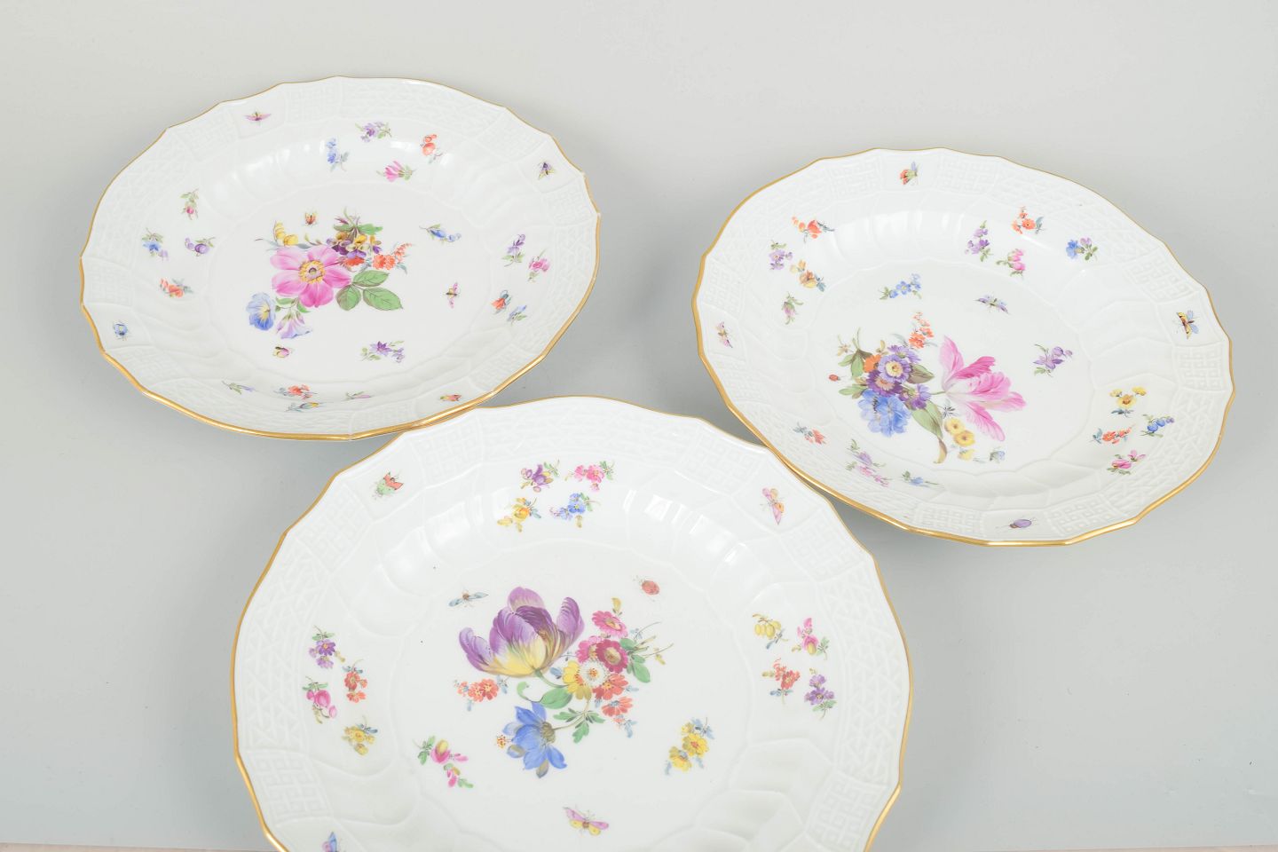 Elegant sæt håndmalede tallerkener i hvidt porcelæn med farverige blomsterbuketter, små spredte blomster og profileret reliefkant med guldbort. Klassisk Meissen-arbejde af høj kvalitet.