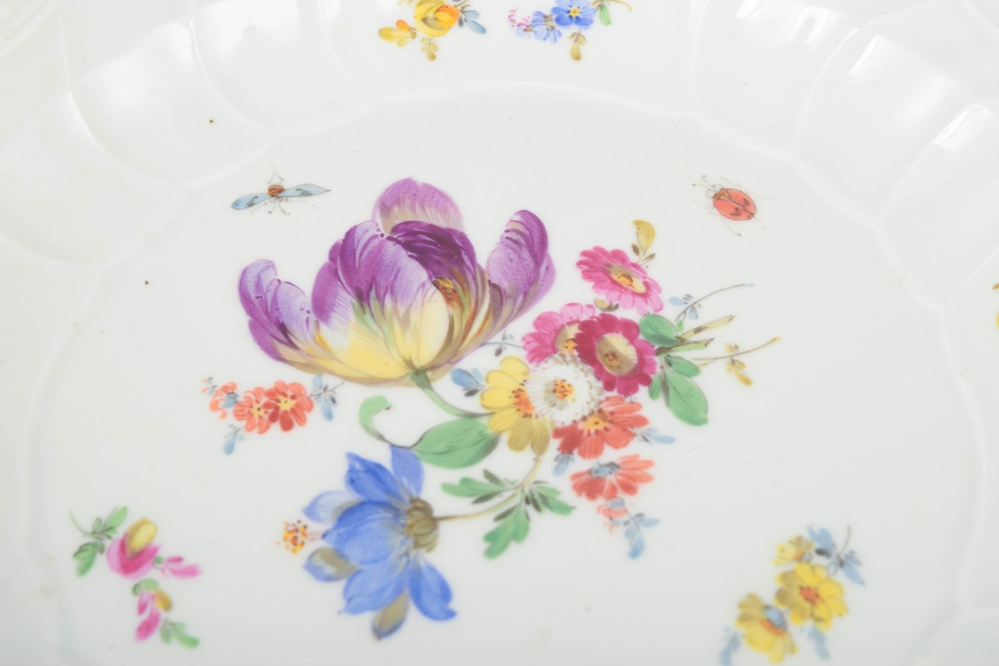Meissen, grundlagt i 1710, er Europas ældste porcelænsfabrik og berømt for sine håndmalede blomstermotiver og tekniske perfektion. Reliefrandede modeller som disse blev populære i begyndelsen af 1900-tallet og fortsætter med at være eftertragtede blandt samlere.