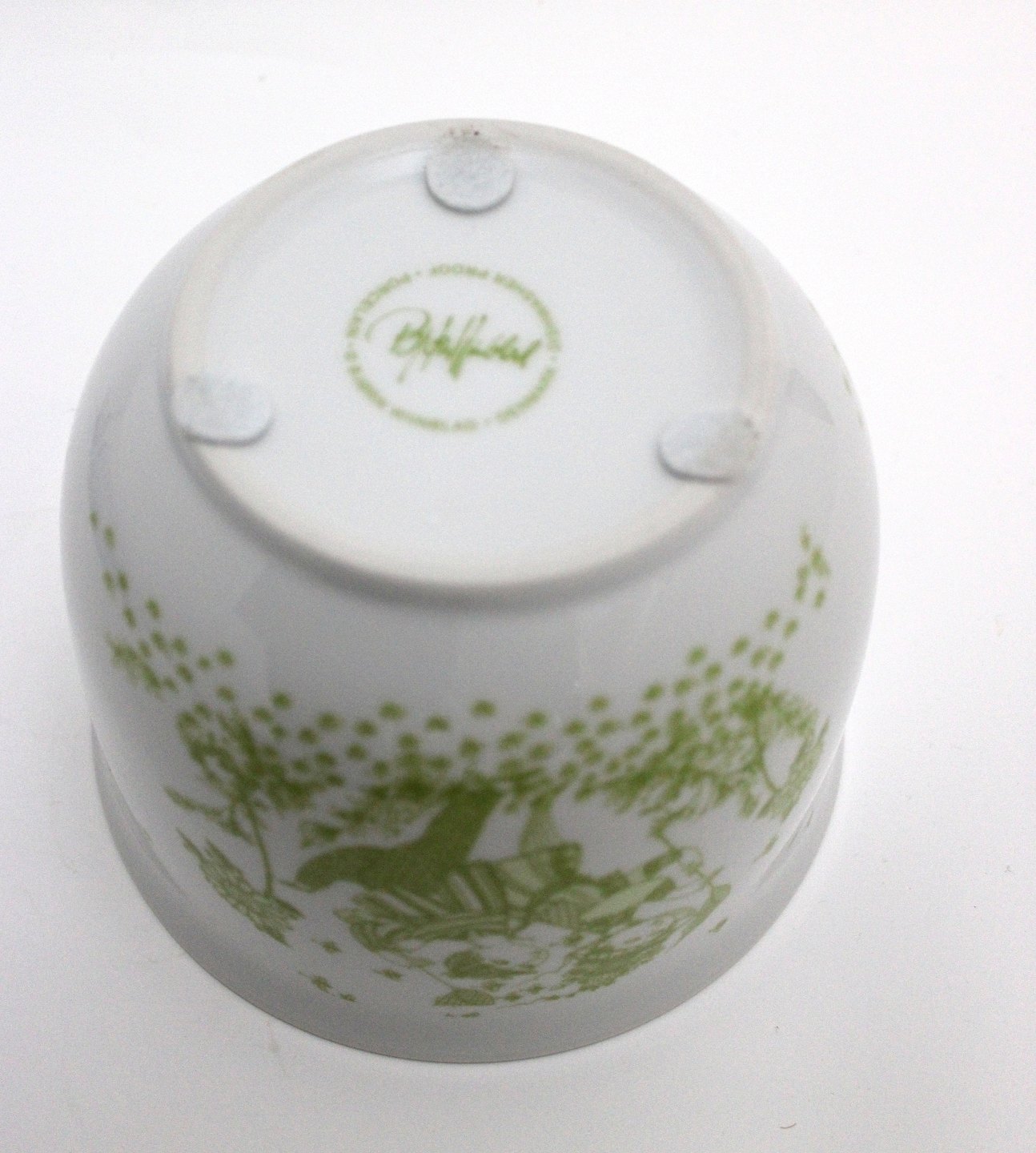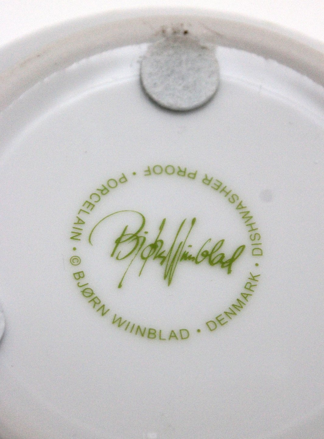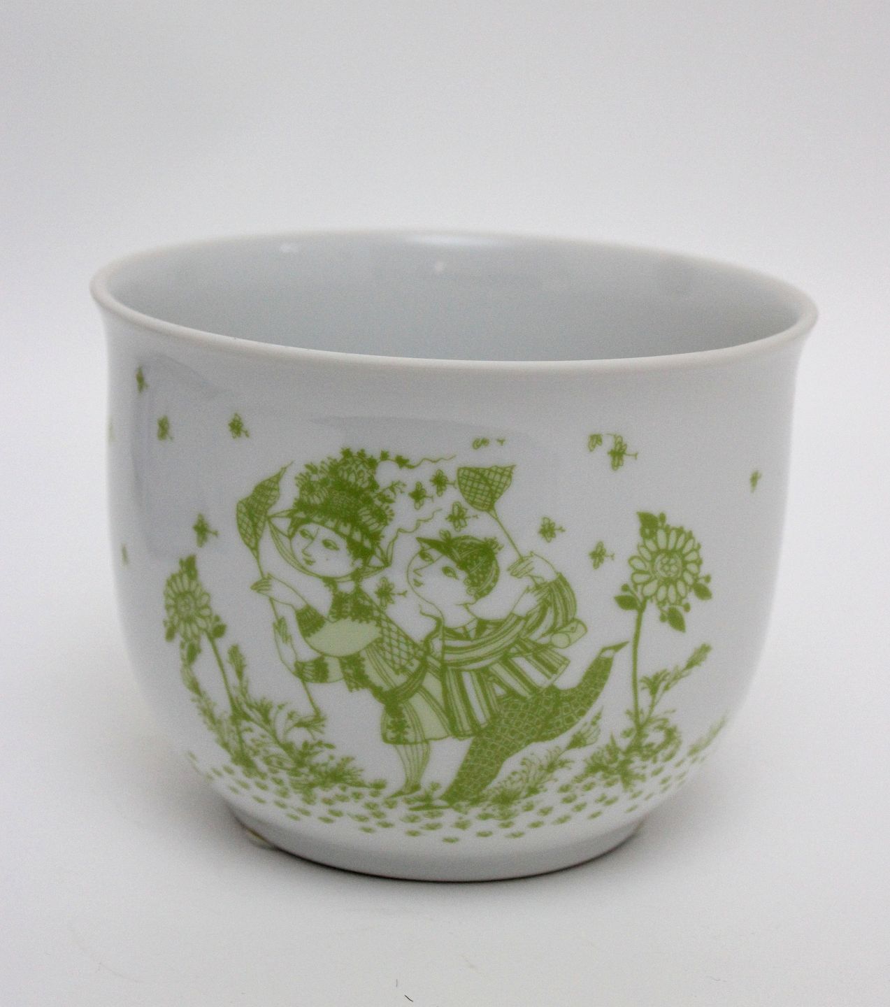 Text zugänglich auf Dänische: Bjørn Wiinblad, Urtepotteskjuler med limegrønt motiv med et par der fanger sommerfugle. Nyproduceret. Dishwasher proof. Højde 12,51 cm. Øverste diameter 16 cm. Pris: 275 kr.