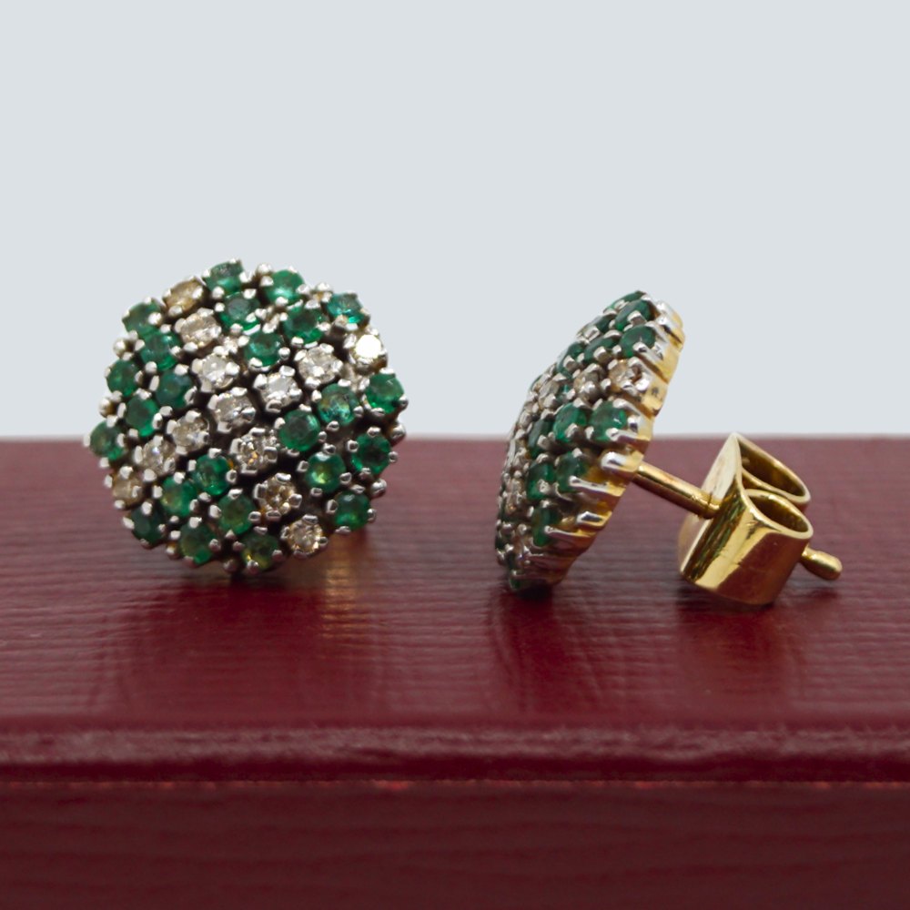 A pair of large round earrings in 14 kt. gold. adorned with diamonds and emeralds, set in white gold. diamonds total 0.56 ct. With large strong clasp. Dia 1.5 cm.