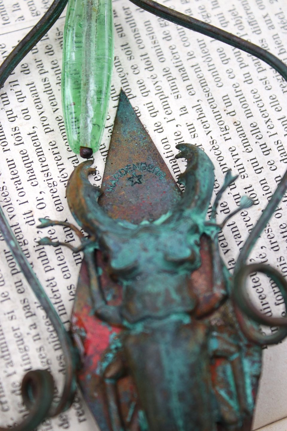 Unika blomsterpind i kobber med glas perle og insekt lavet af smykke kunstneren Torben Hardenberg. Højde: 28cm.