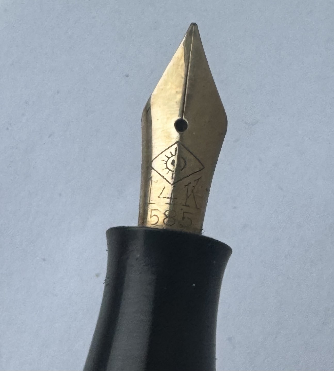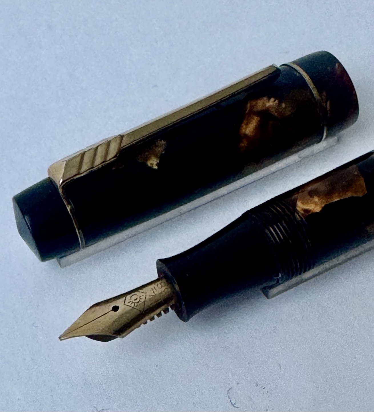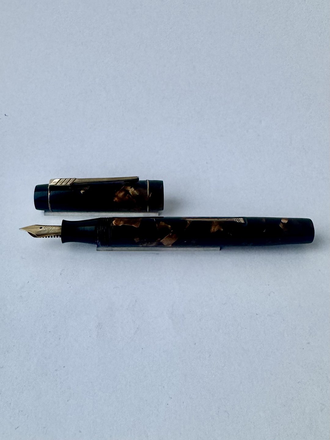 Black and brown marbled Croxley fountain pen. Lever filler ink refill system. New rubber sack must be inserted before the pen can absorb ink and write again. Unoriginal 14 carat gold nib. Length: 12.5 cm