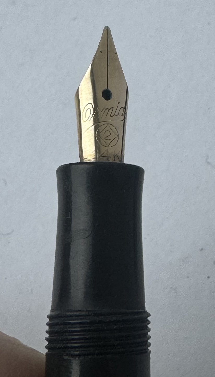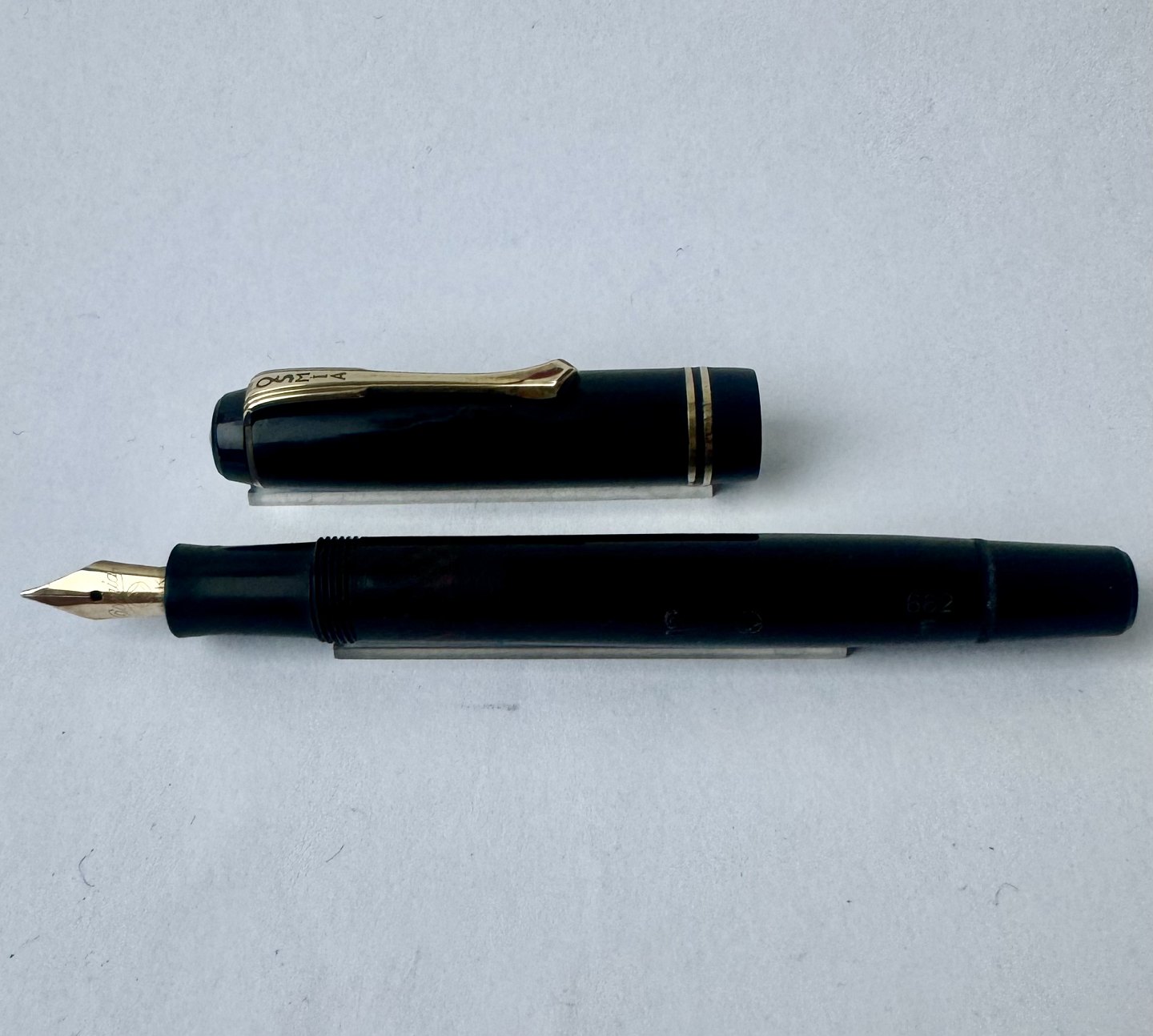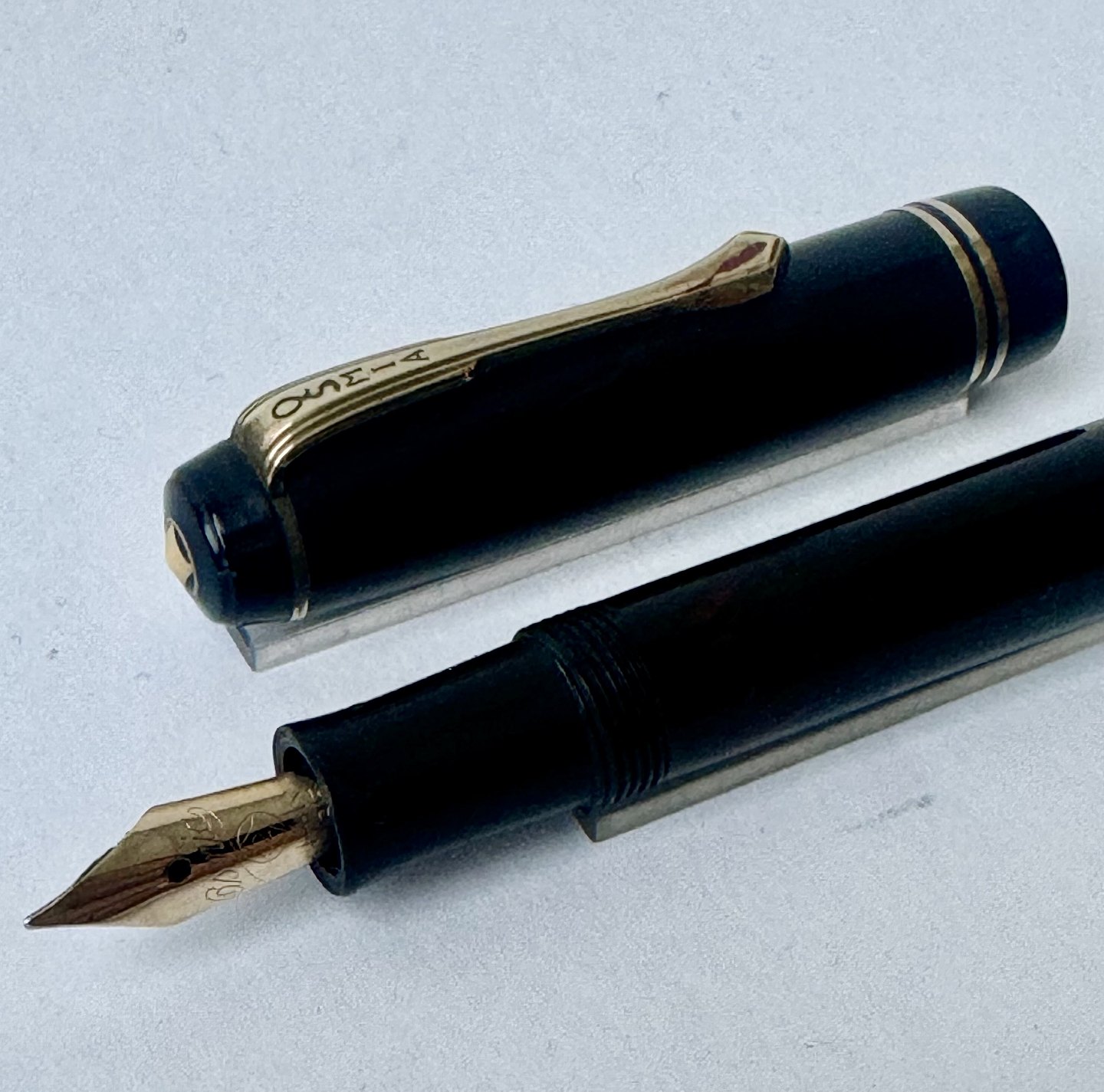 Black Osmia fountain pen with piston filler that needs to be repaired before the fountain pen can absorb ink and write again. Appears in good condition without damage. All parts original to this model including an Osmia number 2 gold nib in 14 carats. Length 11,5 cm