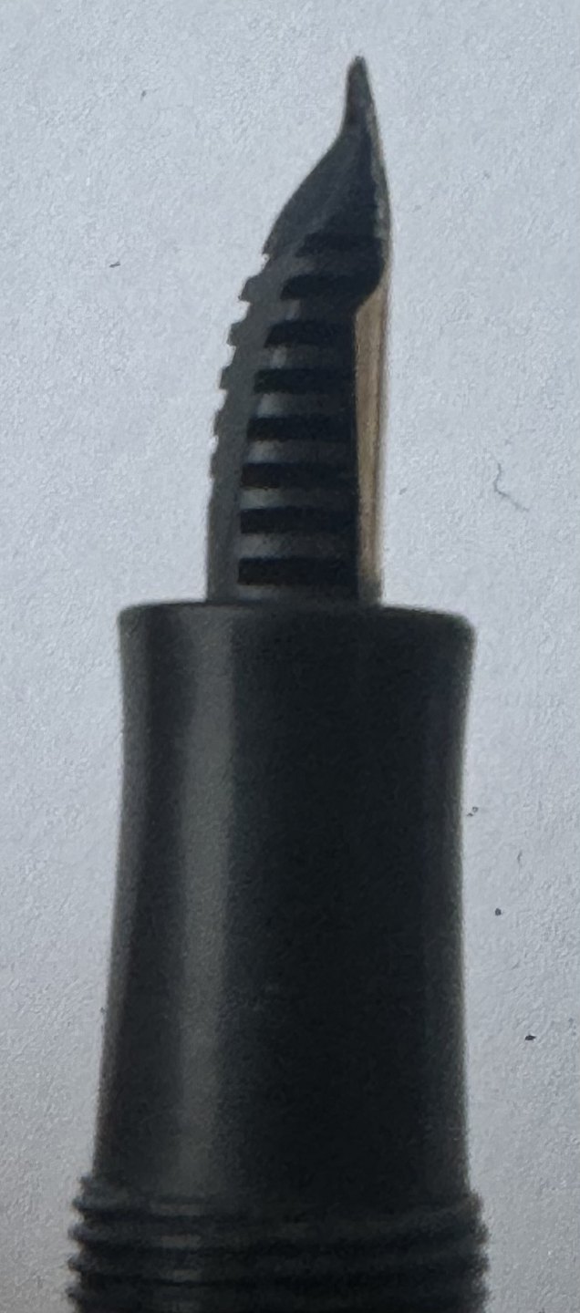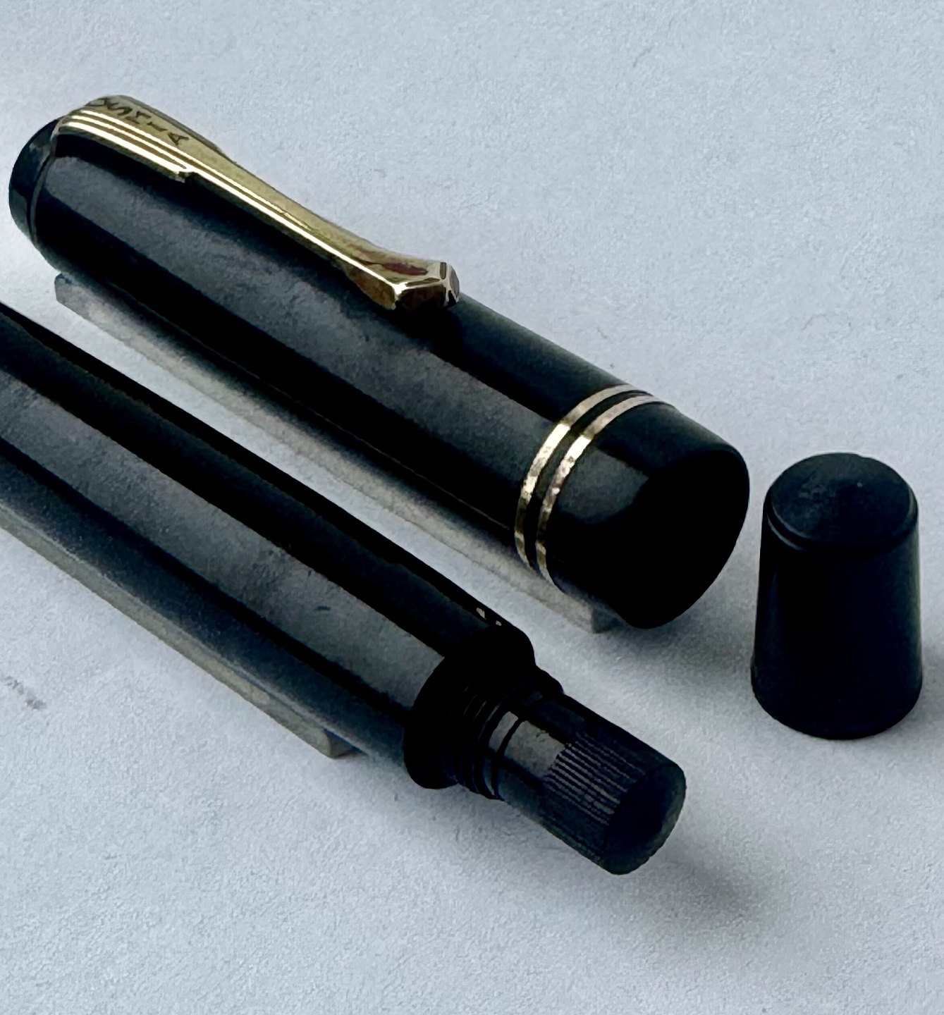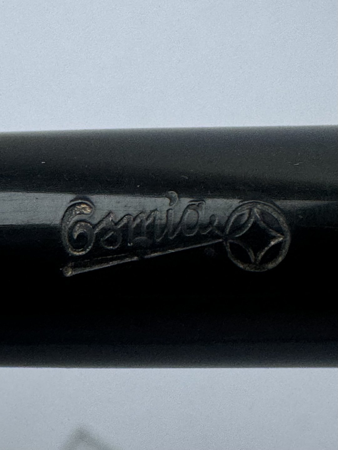 Black Osmia fountain pen with piston filler that needs to be repaired before the fountain pen can absorb ink and write again. Appears in good condition without damage. All parts original to this model including an Osmia number 2 gold nib in 14 carats. Length 11,5 cm