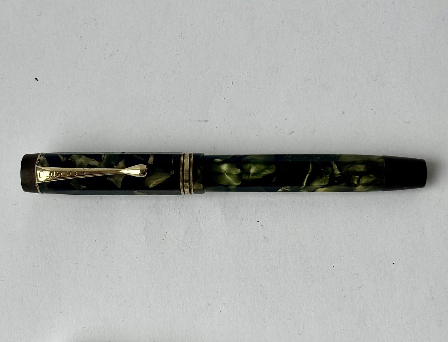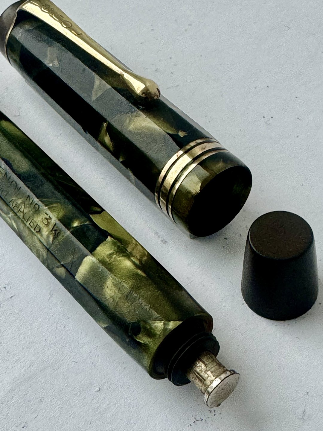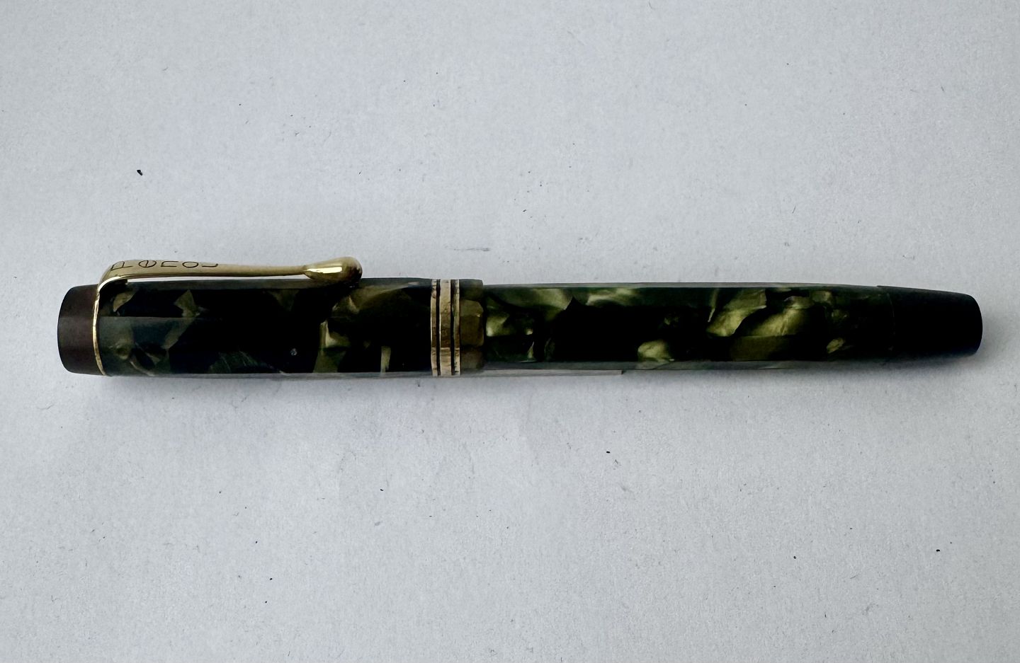 10-sides and green marbled Penol 3k fountain pen. In good condition with all original Penol parts. Including a 14 carat gold nib. A new rubber sack must be inserted so that the pen can absorb ink and write again. Length: 13.3 cm.