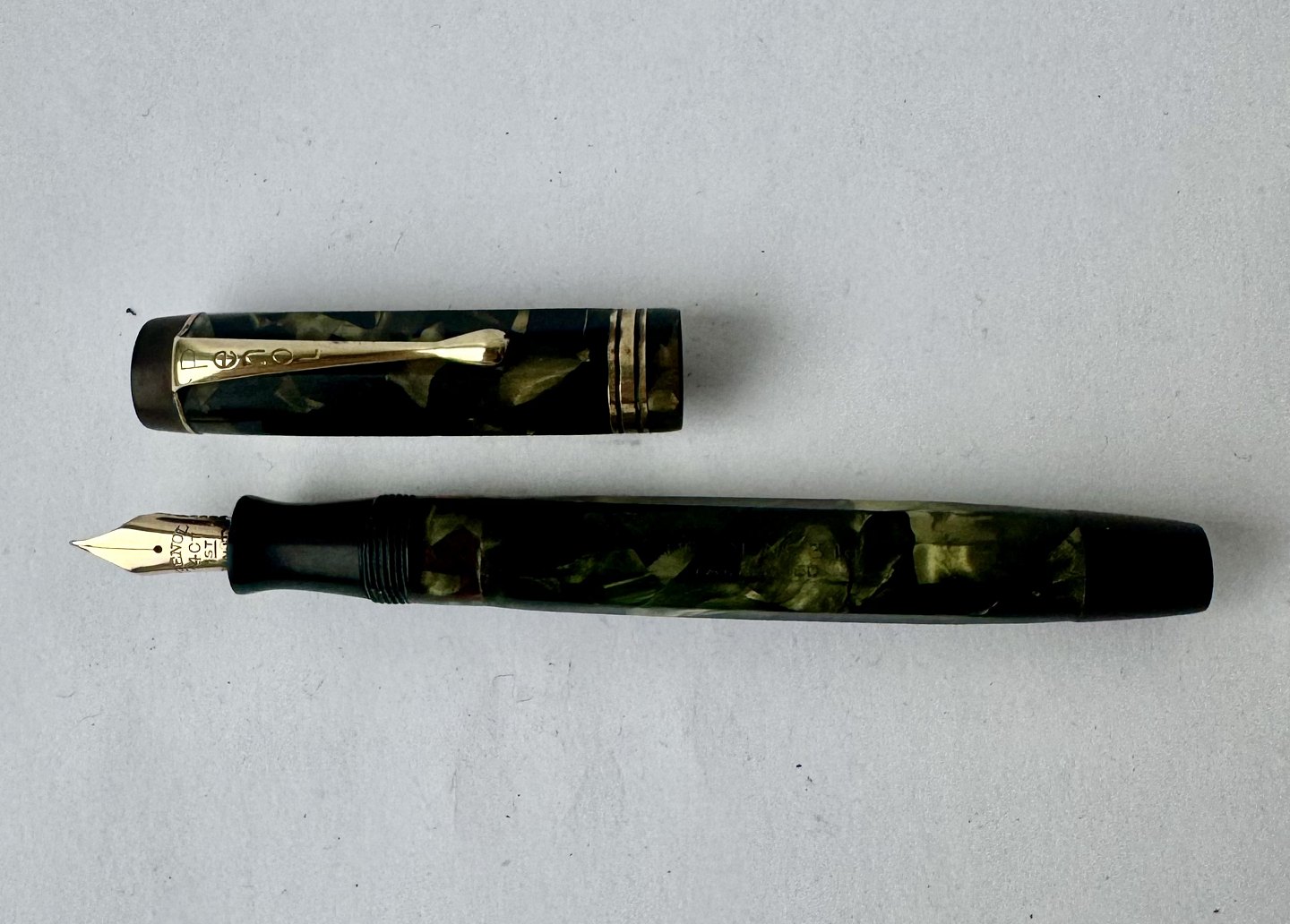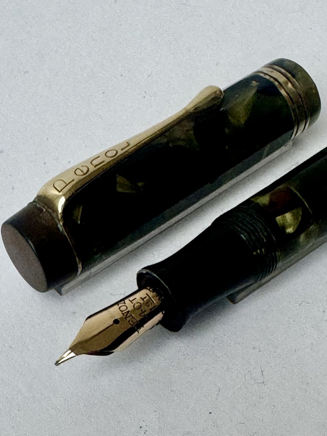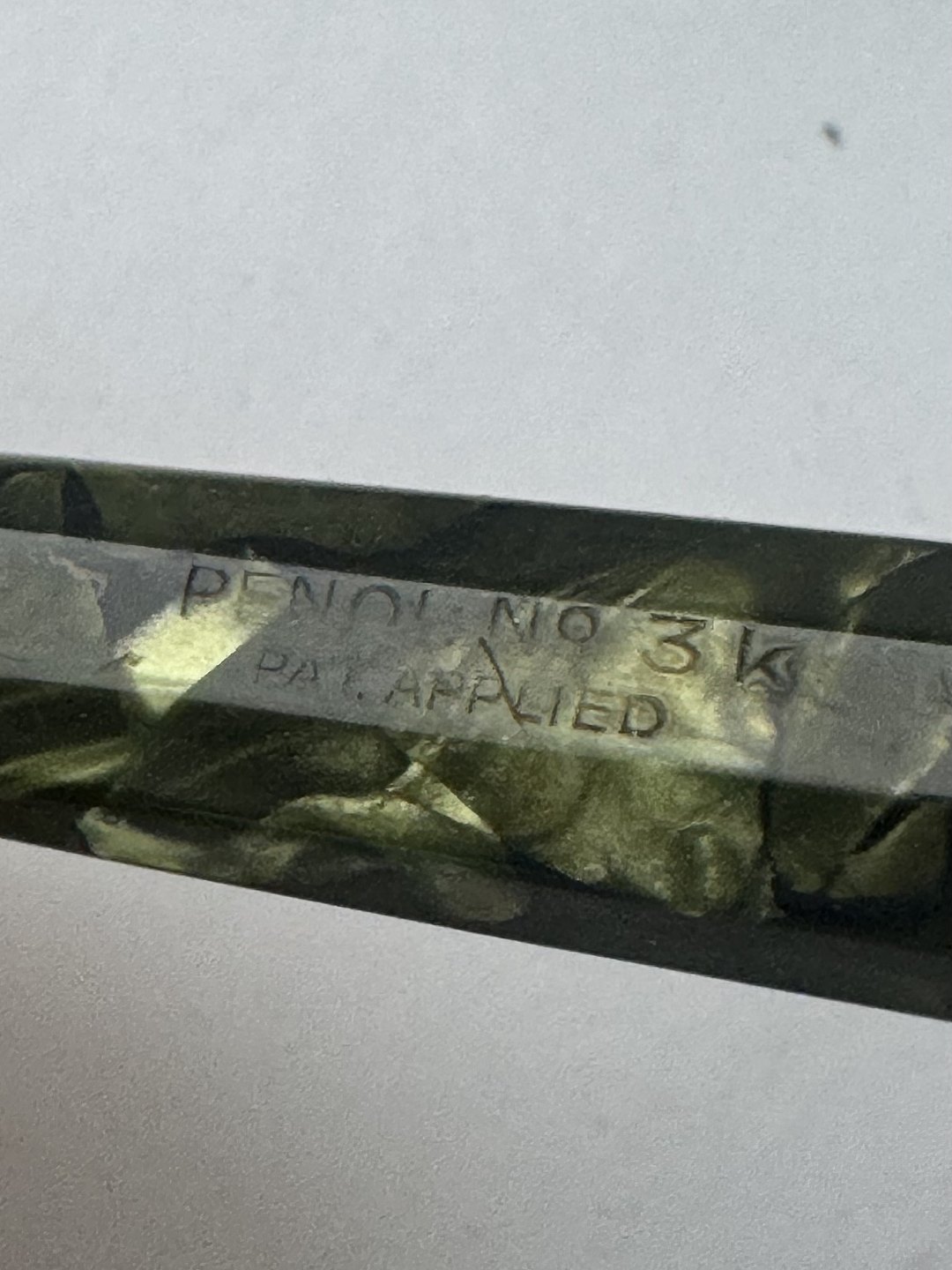10-sides and green marbled Penol 3k fountain pen. In good condition with all original Penol parts. Including a 14 carat gold nib. A new rubber sack must be inserted so that the pen can absorb ink and write again. Length: 13.3 cm.