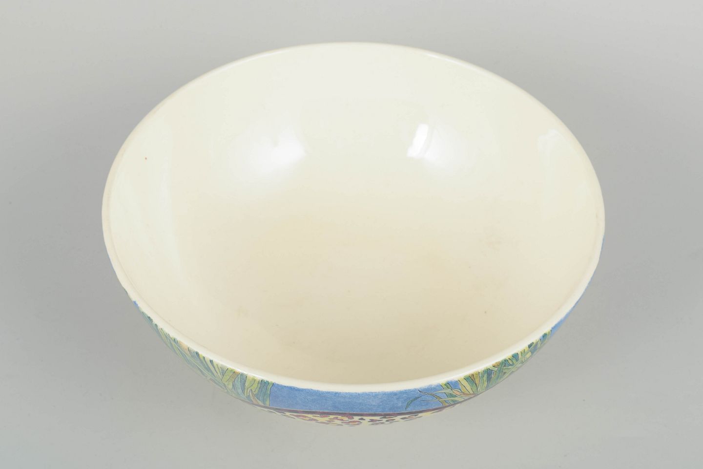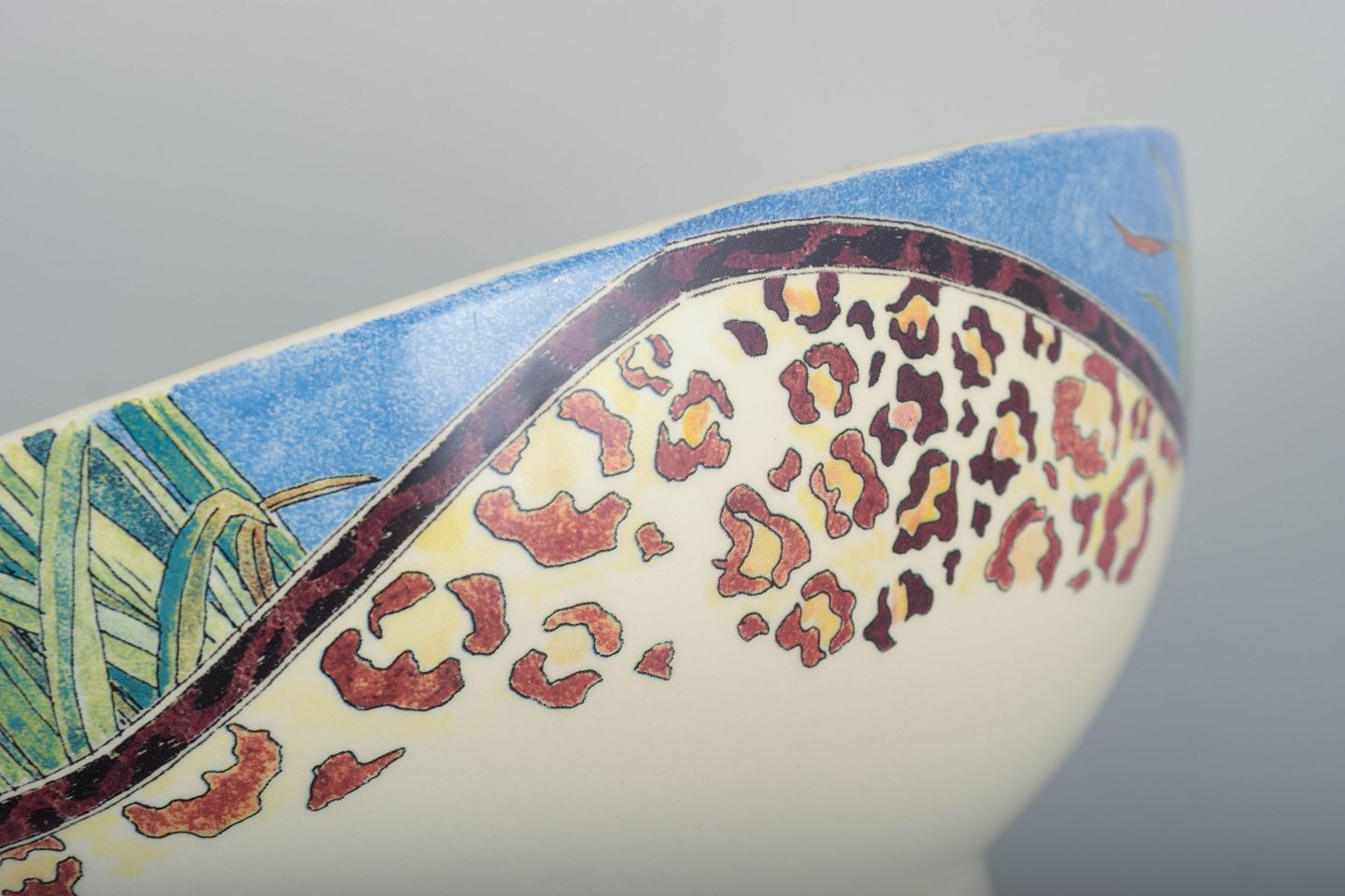 Dekorativ fajanceskål fra Gien i det farvestærke “Savane”-mønster med bølgende bort, græsdekoration og leopardinspirerede detaljer. En karakteristisk del af seriens livlige og naturorienterede design.