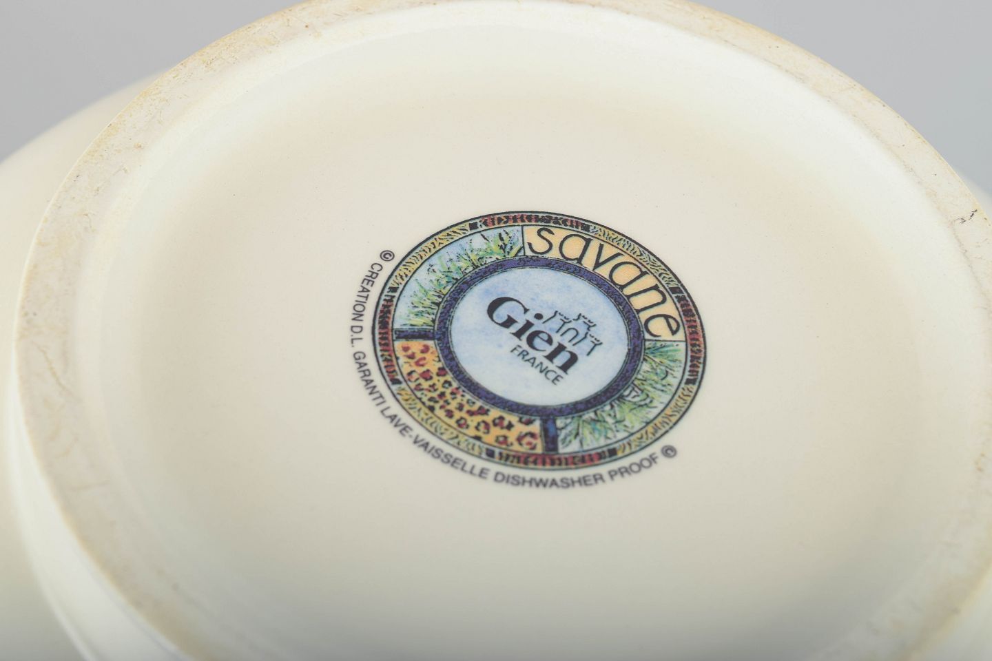 Gien, grundlagt i 1821, har en lang tradition for kunstnerisk dekoreret fajance, ofte med naturmotiver og rigt varierede farver. Serien “Savane” fra 1980’erne er et tydeligt eksempel på fabrikkens ekspressive formsprog, som i dag nyder stor popularitet blandt samlere af fransk dekorativ keramik.