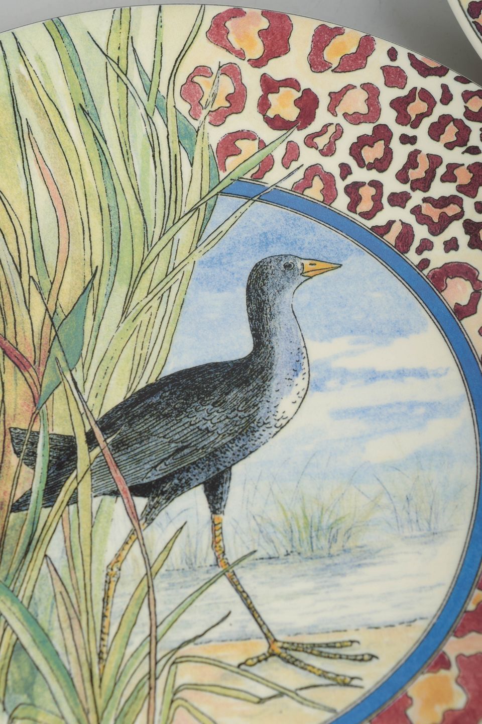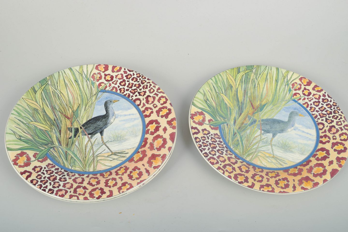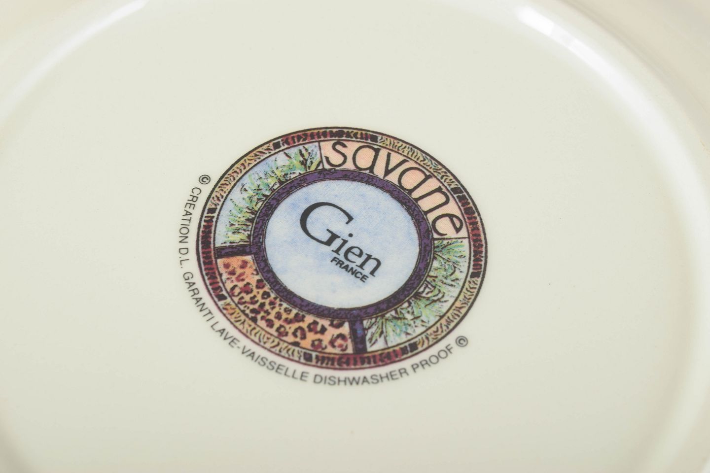 Dekorative fajancetallerkener fra Gien i det livlige “Savane”-mønster med naturalistisk dyremotiv og farverig bort. Et karakteristisk eksempel på fabrikkens kunstneriske udsmykning i 1980’erne.