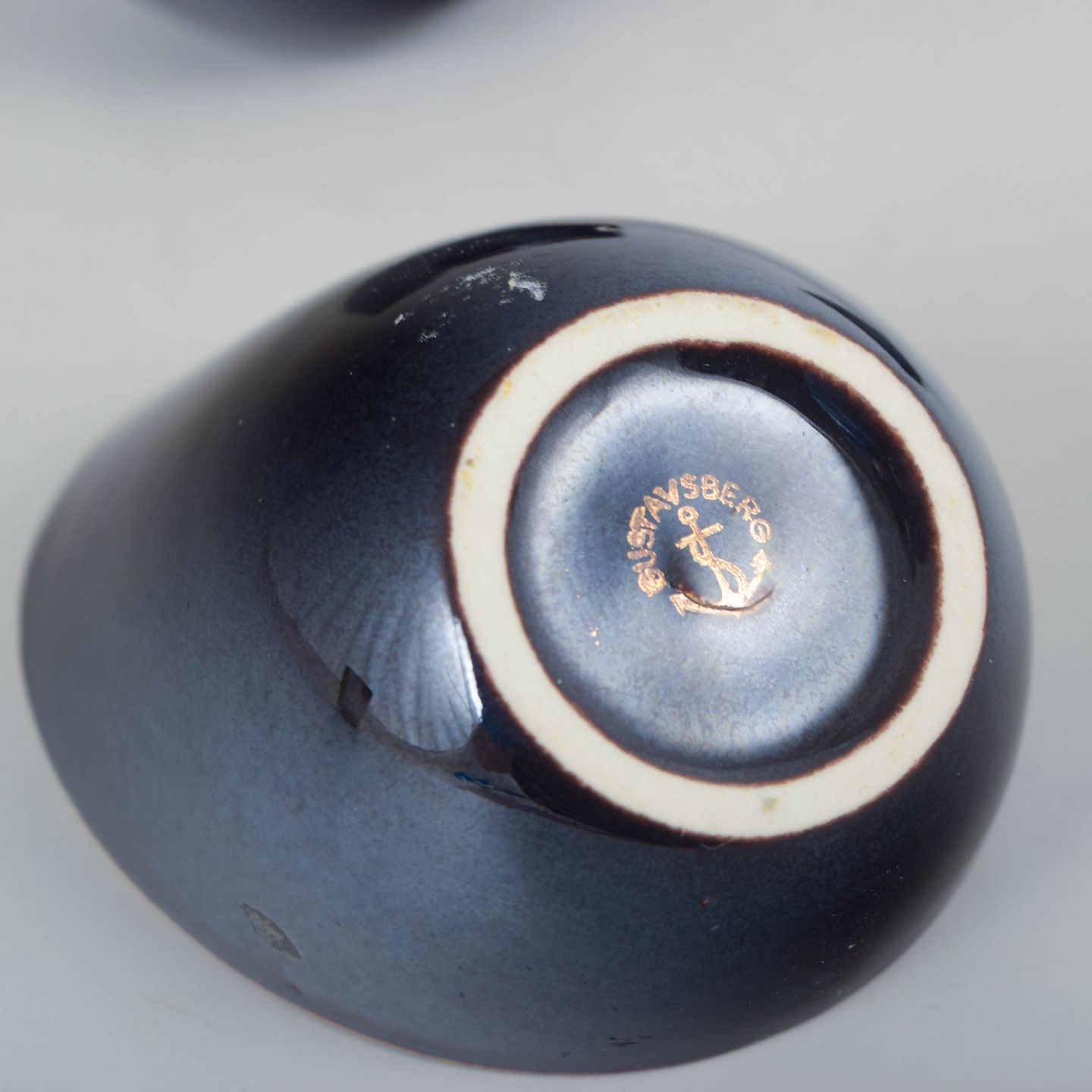 Tre små håndglaserede skåle i dyb blå glasur, hvoraf én dekoreret med et elegant guldfarvet fiskemotiv. Klassisk Gustavsberg-æstetik i miniatureformat.