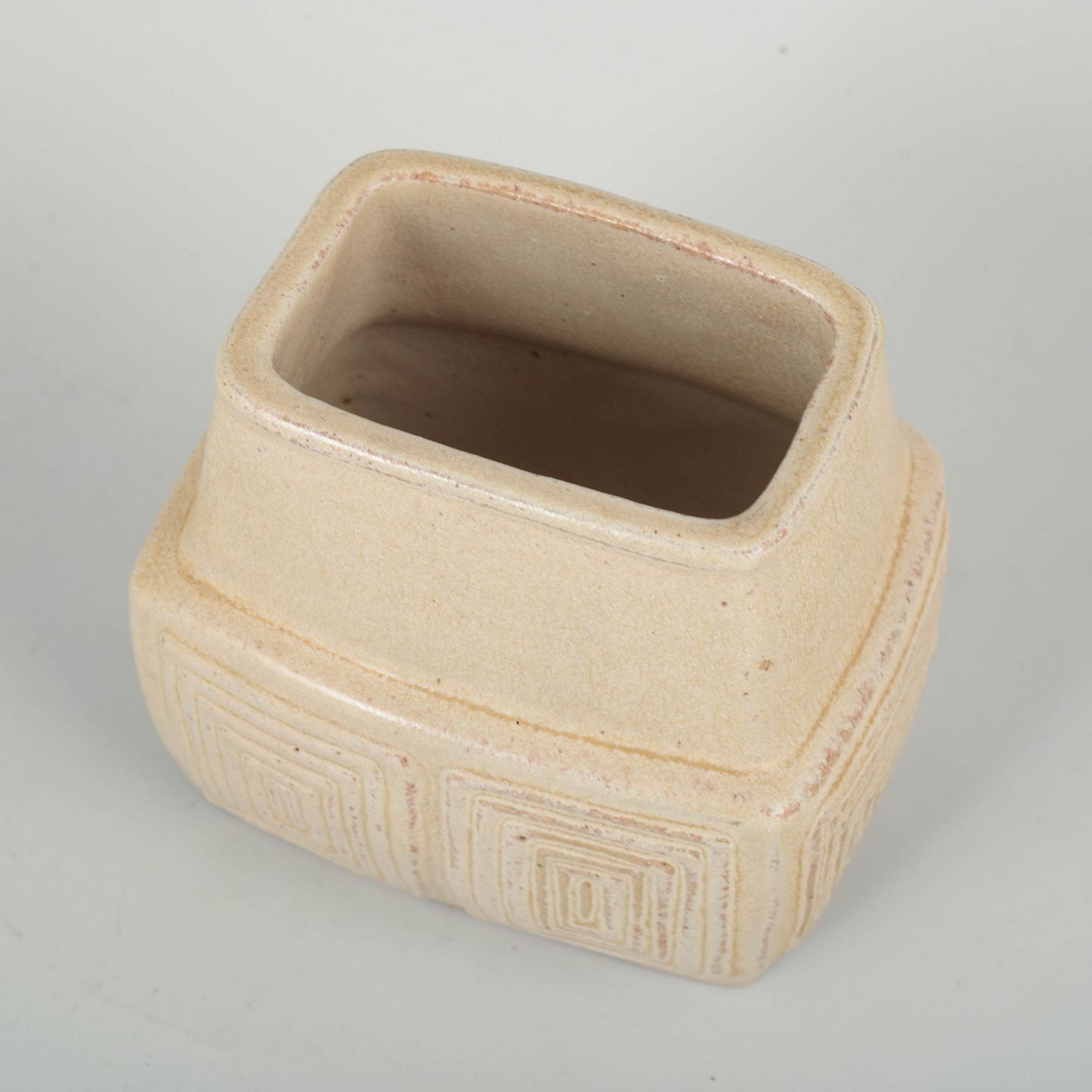 Håndglaseret stentøjsvase i lys, mat glasur med indpresset geometrisk reliefdekoration. Den skarpt modellerede, kantede form er karakteristisk for L. Hjorths modernistiske stentøjsproduktion i midten af århundredet.