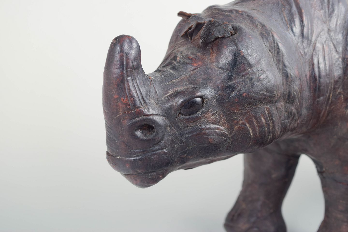 Håndlavet figur af et næsehorn udført i formet og syet læder, muligvis solgt gennem Liberty & Co., London. Figuren har flot modellerede detaljer og en naturlig patina, der fremhæver det håndværksmæssige udtryk.