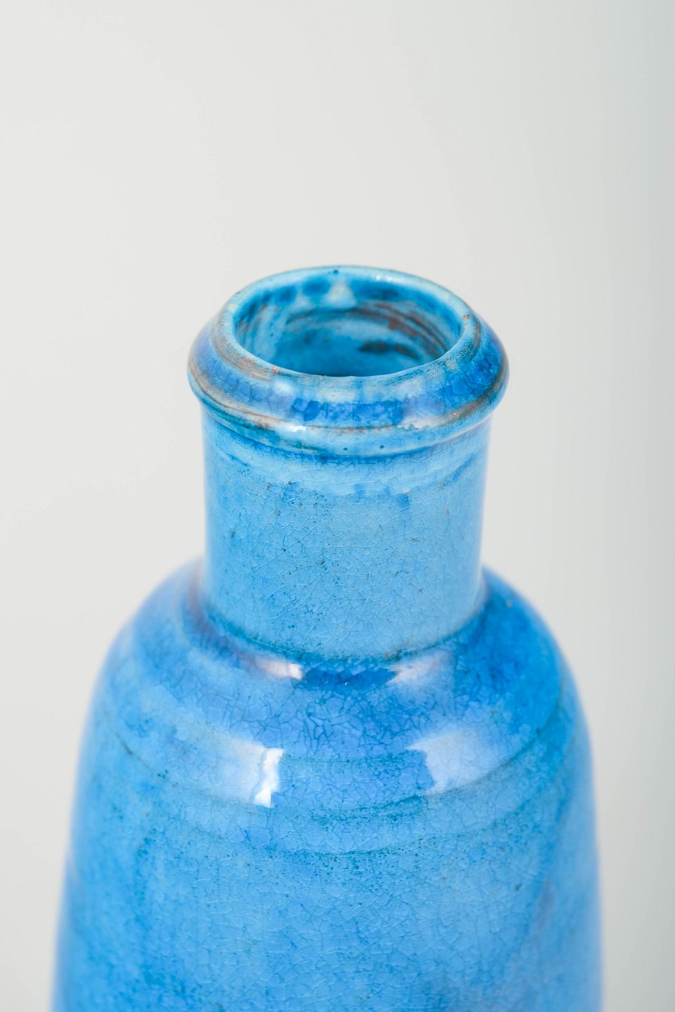 Elegant cylindrisk vase i den ikoniske azurblå glasur, karakteristisk for Kähler-værkstedets produktion i 1960’erne. Formen er let konisk med et smallere mundingsparti og en jævnt påført, levende glasur, der fremhæver den hånddrejede karakter.