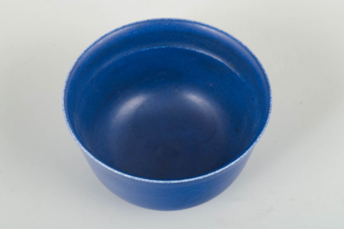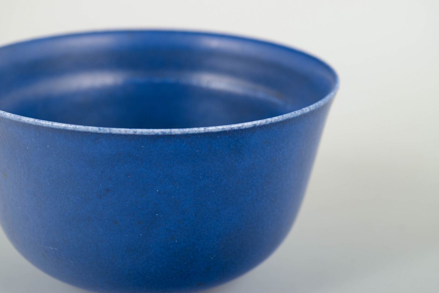 En elegant, Saxbo skål i karakteristisk dybblå reduktionsglasur. Formen er ren og stram, typisk for værkstedets modernistiske udtryk og høje tekniske niveau.